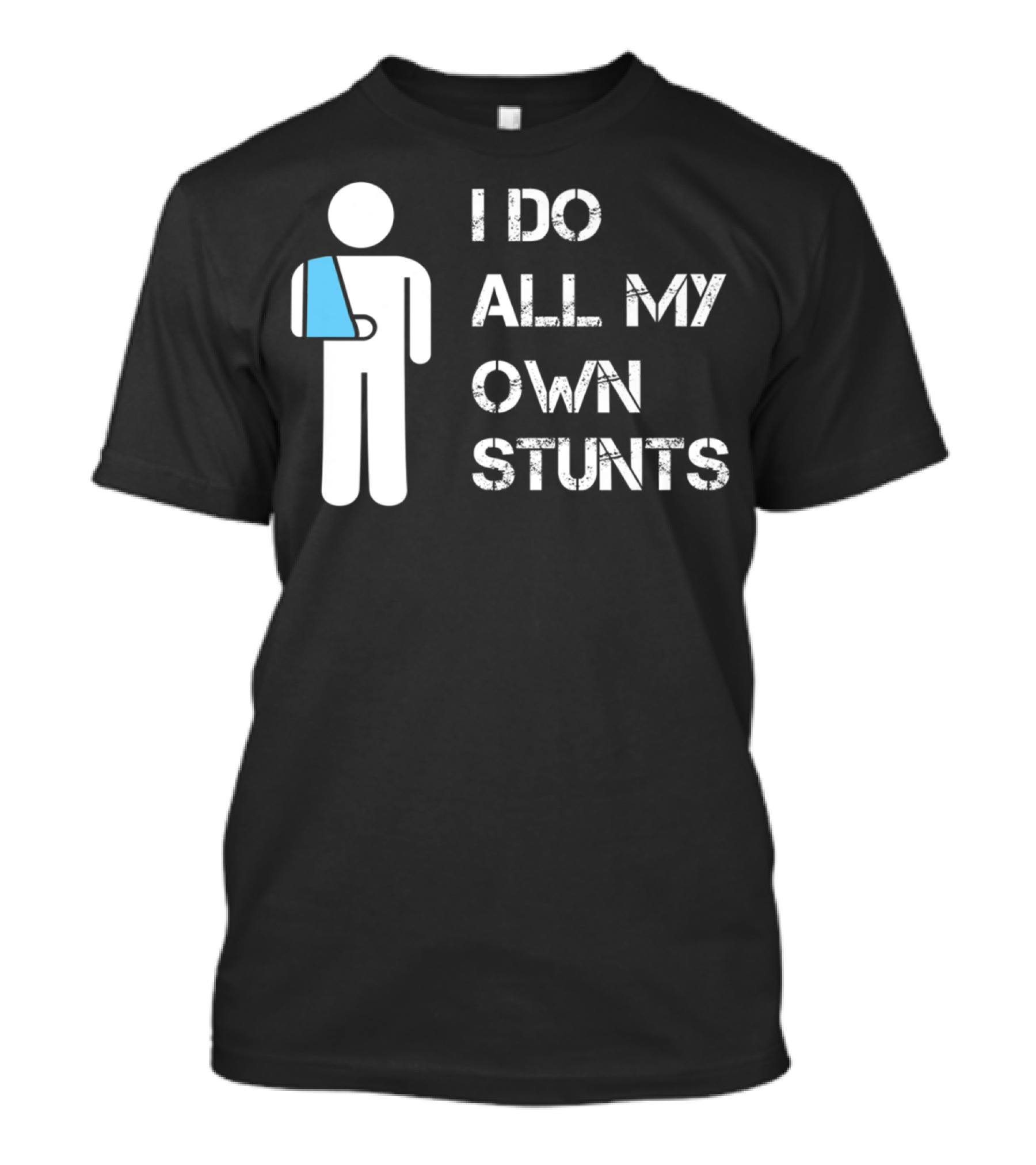 The I Do All My Own Stunts Funny Broken Arm Stick Figure with Blue Sling T-shirt is designed for everyday wear and a consistent fit. Fabric is pre-shrunk ring-spun cotton with durable stitching. See the size chart below for exact measurements.
