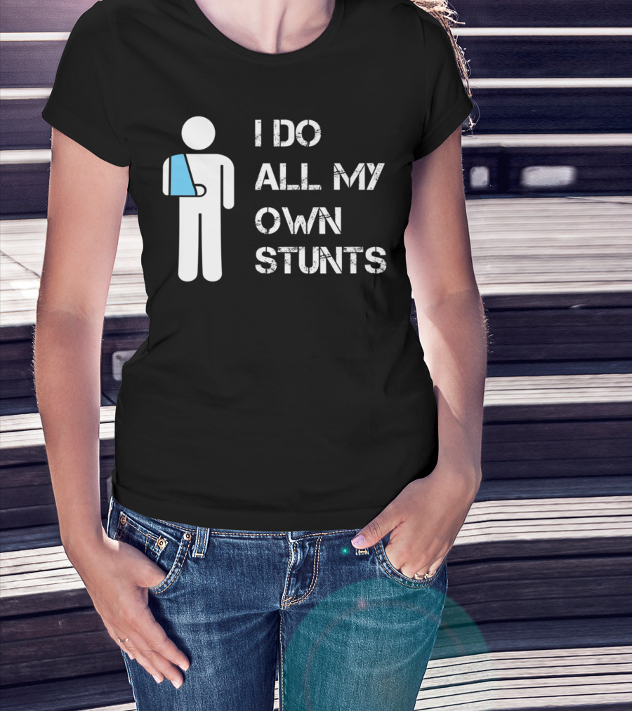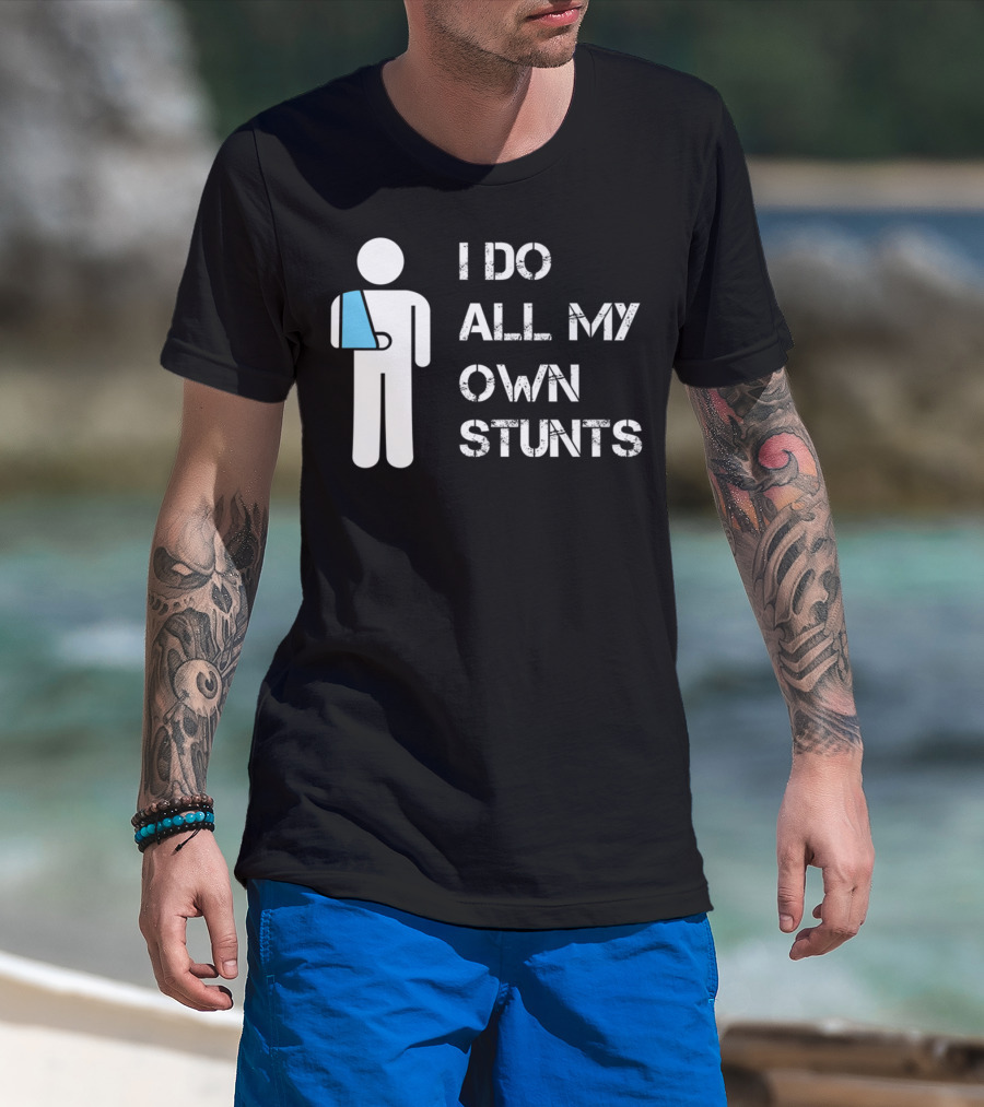 I Do All My Own Stunts Funny Broken Arm Stick Figure With Blue Sling T-Shirt