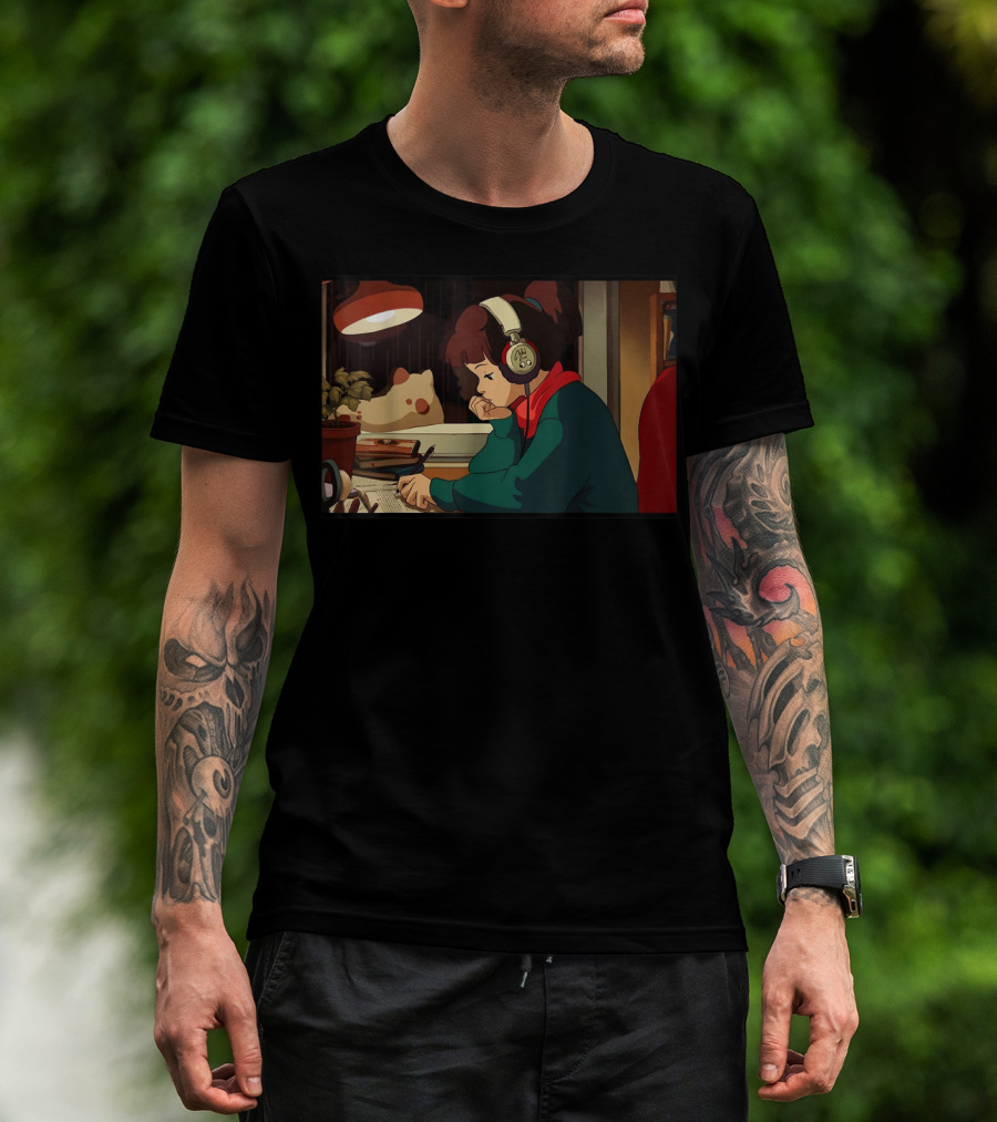 The Lofi Hip Hop Chill Hop Relaxing Jazz Hop Beats Girl with Headphones Studying at Desk T-shirt is designed for everyday wear and a consistent fit. Fabric is pre-shrunk ring-spun cotton with durable stitching. See the size chart below for exact measurements.