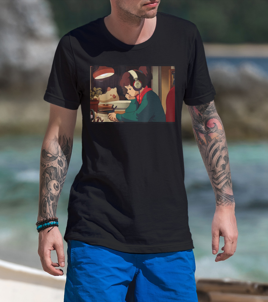 Lofi Hip Hop Chill Hop Relaxing Jazz Hop Beats Girl With Headphones Studying At Desk T-Shirt