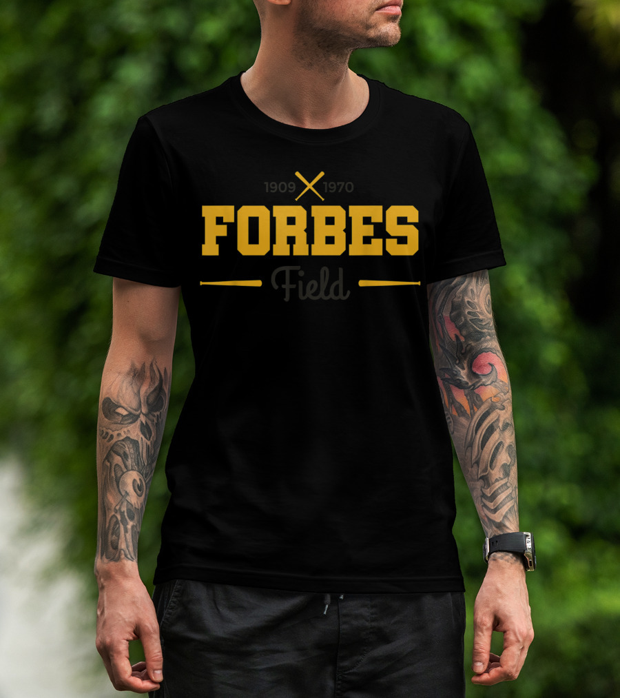 The Forbes Field 1909-1970 Pittsburgh Baseball Crossed Bats and Bat T-shirt is designed for everyday wear and a consistent fit. Fabric is pre-shrunk ring-spun cotton with durable stitching. See the size chart below for exact measurements.