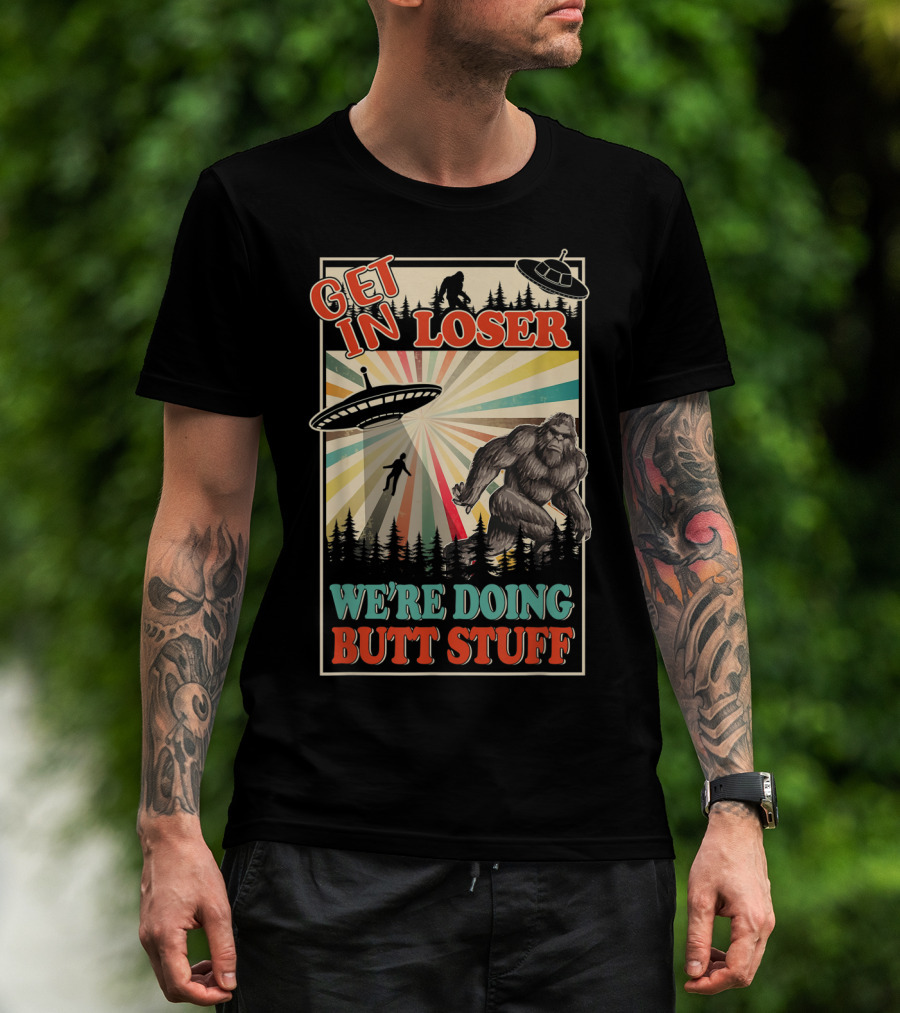 Get In Loser We're Doing Butt Stuff UFO Bigfoot Retro Forest Scene T-Shirt