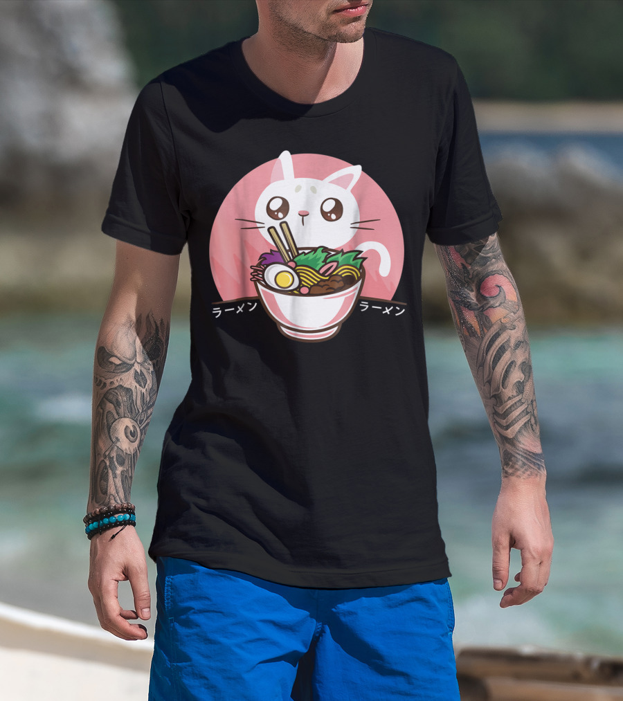 The Kawaii Japanese Ramen Noodles Anime Cat Love T-shirt is designed for everyday wear and a consistent fit. Fabric is pre-shrunk ring-spun cotton with durable stitching. See the size chart below for exact measurements.