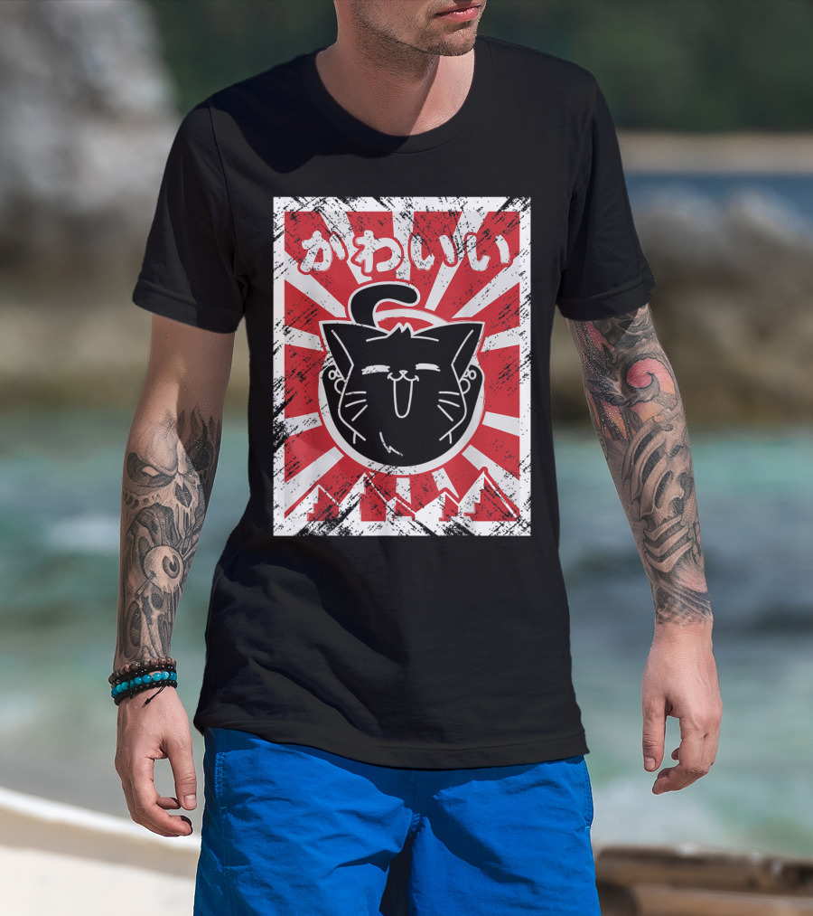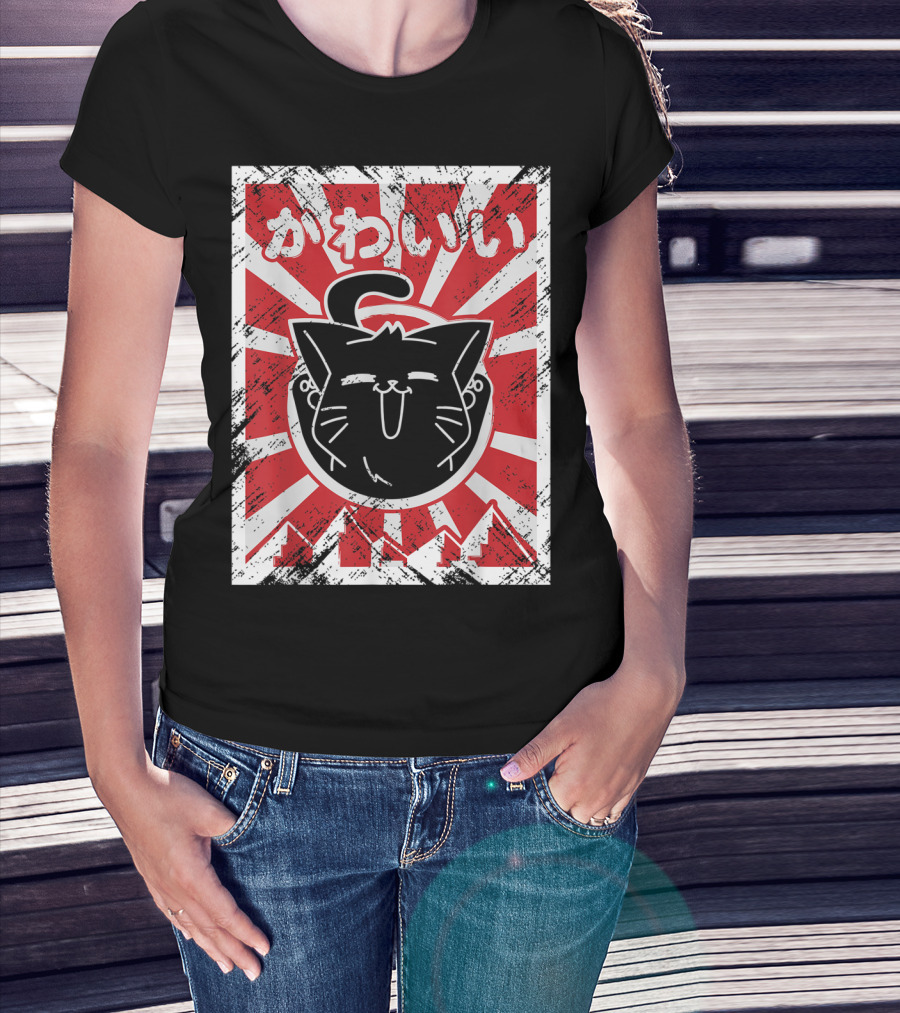 Kawaii Anime Cute Japanese Cat With Red Rising Sun Background T-Shirt
