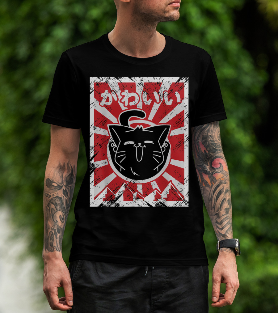 The Kawaii Anime Cute Japanese Cat with Red Rising Sun Background T-shirt is designed for everyday wear and a consistent fit. Fabric is pre-shrunk ring-spun cotton with durable stitching. See the size chart below for exact measurements.
