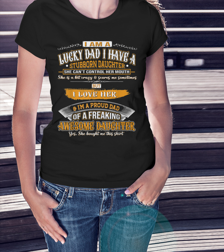 I Am A Lucky Dad I Have A Stubborn Daughter She Can't Control Her Mouth She Is A Bit Crazy But I Love Her And I'm A Proud Dad Of A Freaking Awesome Daughter T-Shirt