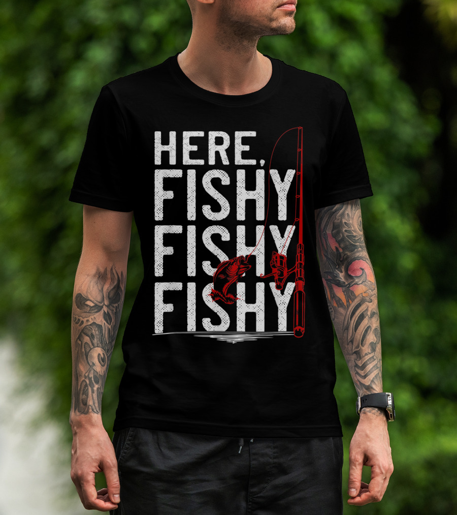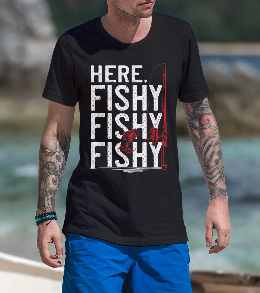 Here Fishy Fishy Fishy Rod And Fish Hook Adventure T-Shirt