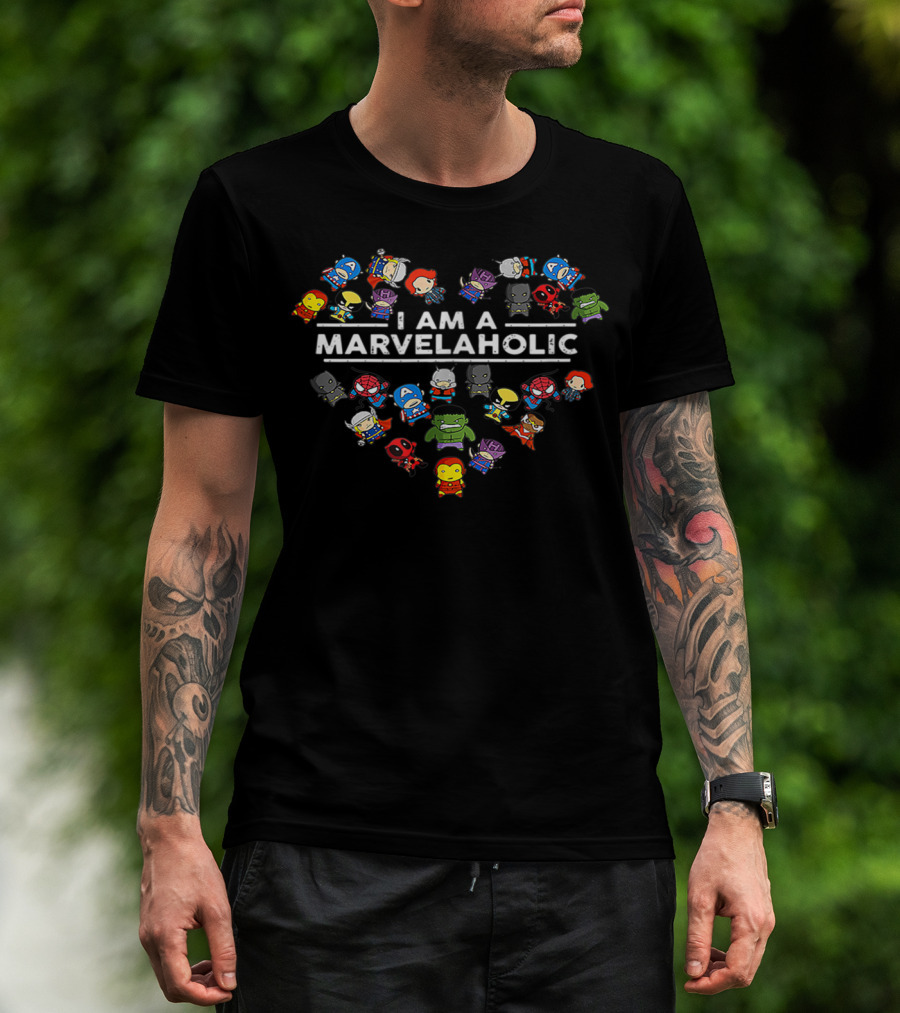 I Am A Marvelaholic Heart Shaped Superhero Characters T-Shirt