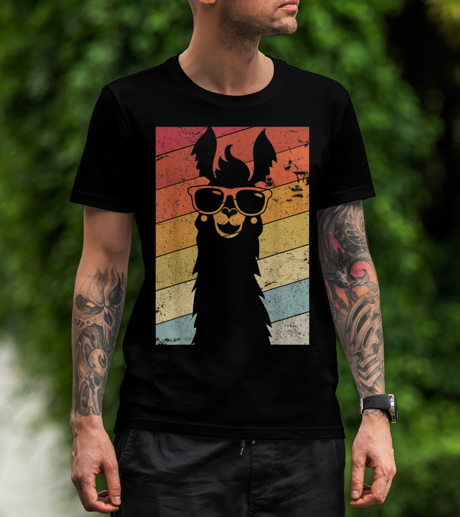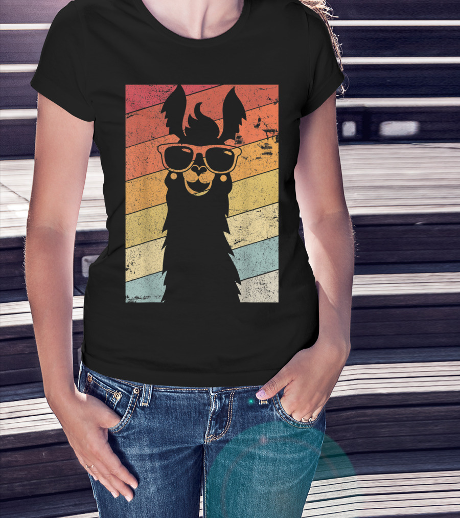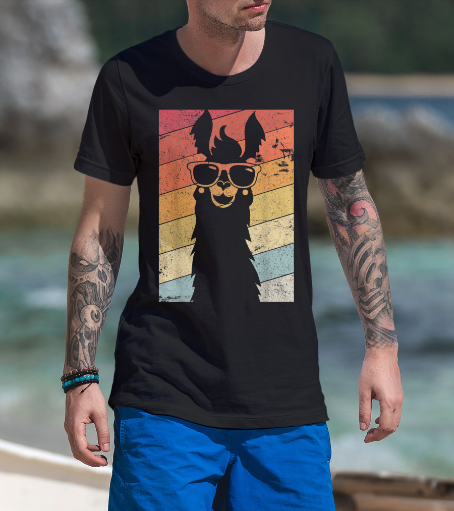 Retro Llama Style Alpaca With Sunglasses On Colorful Stripes T-Shirt
