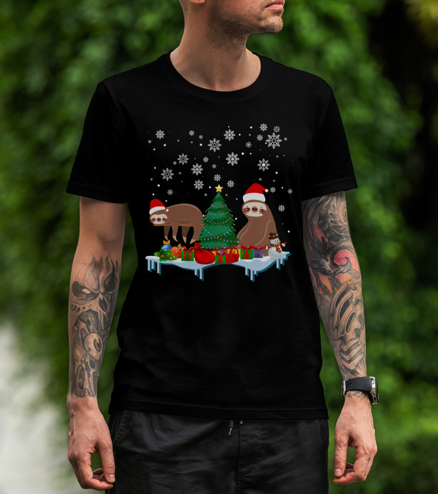 Sloth Merry Christmas Snowflakes Santa Hat Gifts Tree T-Shirt