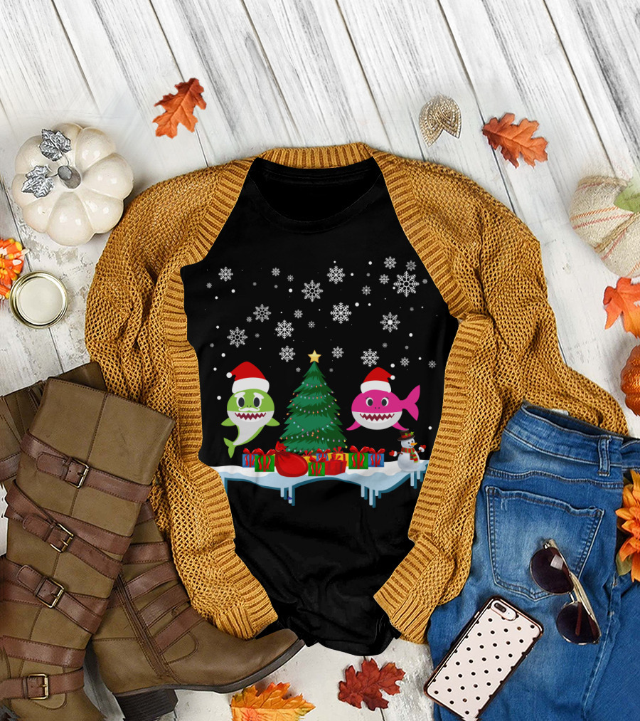 Baby Shark Merry Christmas Tree Snowflakes Santa Hats Gifts T-Shirt