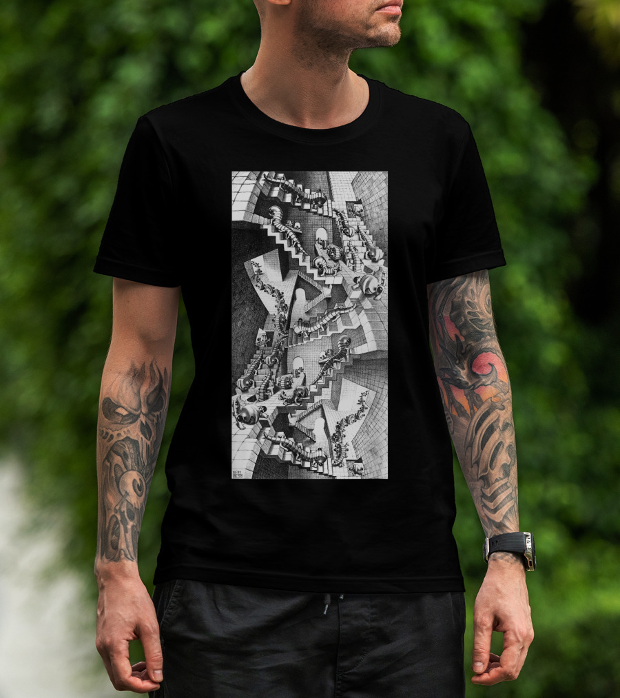 The Escher Relativity Optical Illusion Staircase Maze in Three Colors T-shirt is designed for everyday wear and a consistent fit. Fabric is pre-shrunk ring-spun cotton with durable stitching. See the size chart below for exact measurements.