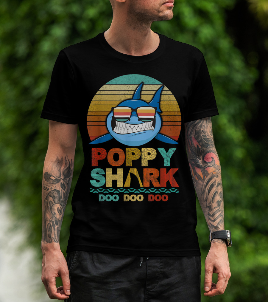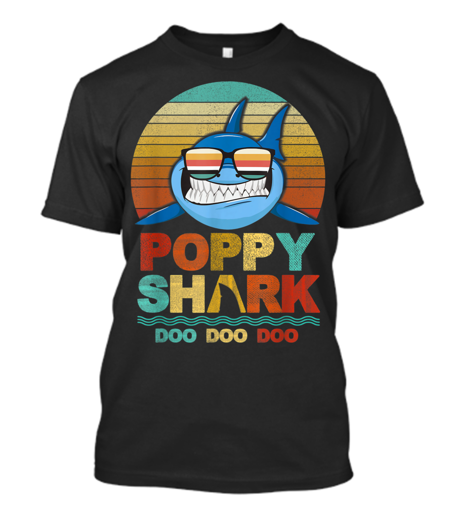 The Poppy Shark Doo Doo Doo Retro Sunglasses T-shirt is designed for everyday wear and a consistent fit. Fabric is pre-shrunk ring-spun cotton with durable stitching. See the size chart below for exact measurements.