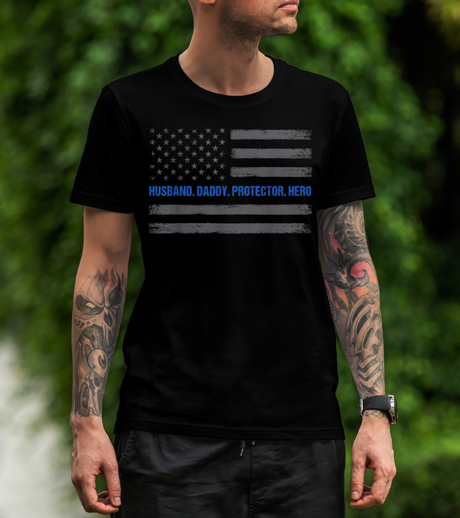 Husband Daddy Protector Hero Thin Blue Line American Flag T-Shirt