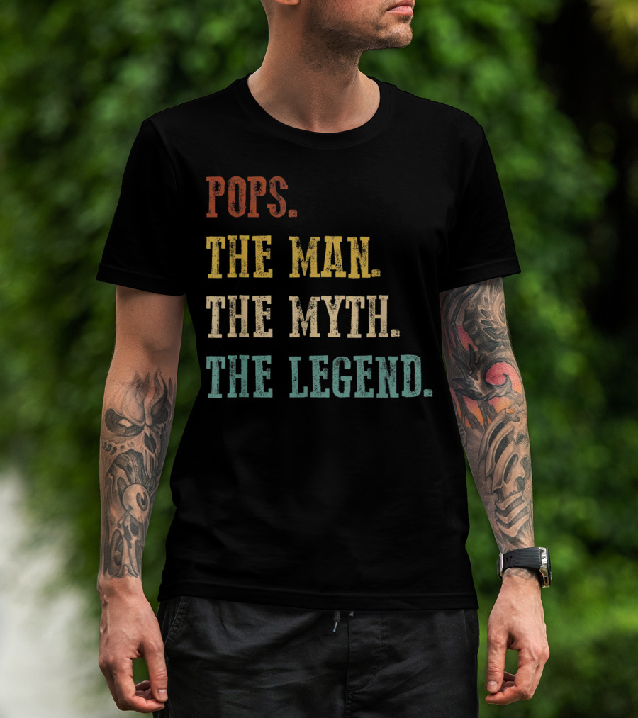 The Mens Pops The Man The Myth The Legend Vintage T-shirt is designed for everyday wear and a consistent fit. Fabric is pre-shrunk ring-spun cotton with durable stitching. See the size chart below for exact measurements.