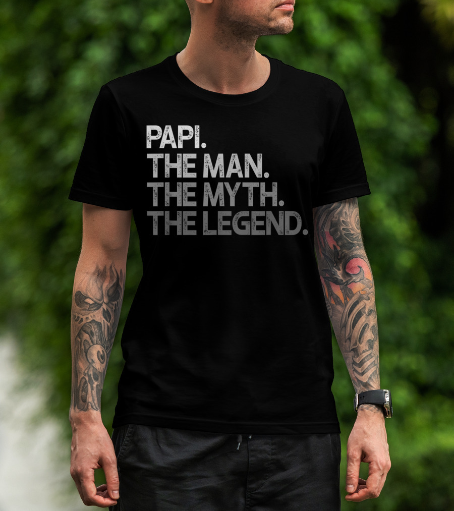 The Papi The Man The Myth The Legend T-shirt is designed for everyday wear and a consistent fit. Fabric is pre-shrunk ring-spun cotton with durable stitching. See the size chart below for exact measurements.