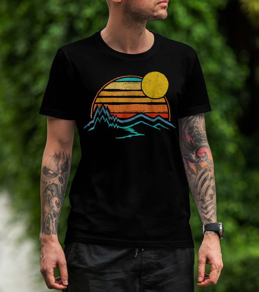 The Sunset Mountains Color Fade with Trees and Sun T-shirt is designed for everyday wear and a consistent fit. Fabric is pre-shrunk ring-spun cotton with durable stitching. See the size chart below for exact measurements.