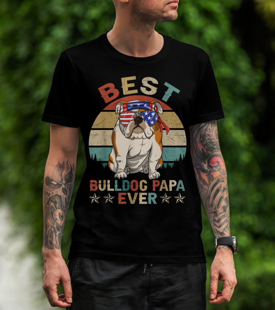 Best Bulldog Papa Ever Vintage Patriotic American Flag Dog T-Shirt