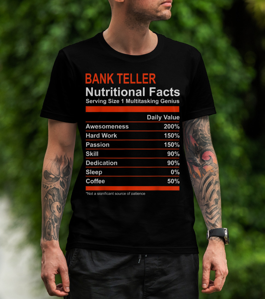 The Bank Teller Nutritional Facts Serving Size 1 Multitasking Genius Awesomeness 200% Hard Work Passion Skill Dedication Sleep Coffee T-shirt is designed for everyday wear and a consistent fit. Fabric is pre-shrunk ring-spun cotton with durable stitching. See the size chart below for exact measurements.