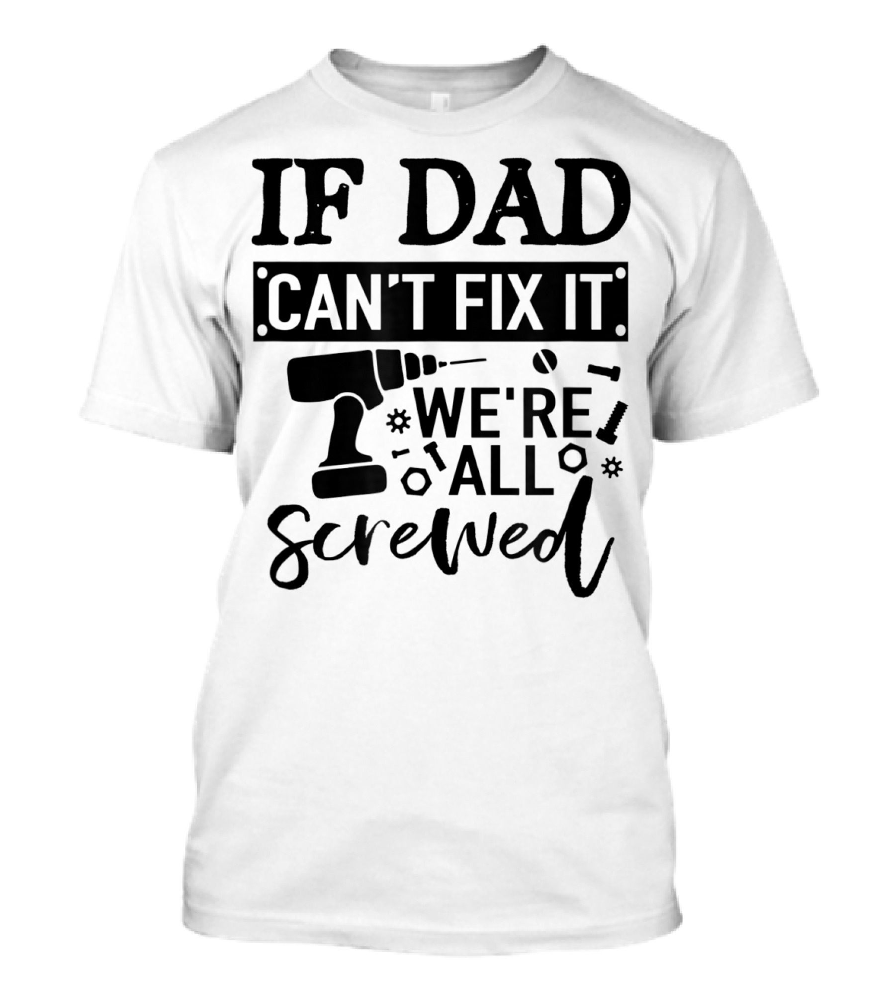 The If Dad Can't Fix It We're All Screwed Drill and Tools T-shirt is designed for everyday wear and a consistent fit. Fabric is pre-shrunk ring-spun cotton with durable stitching. See the size chart below for exact measurements.