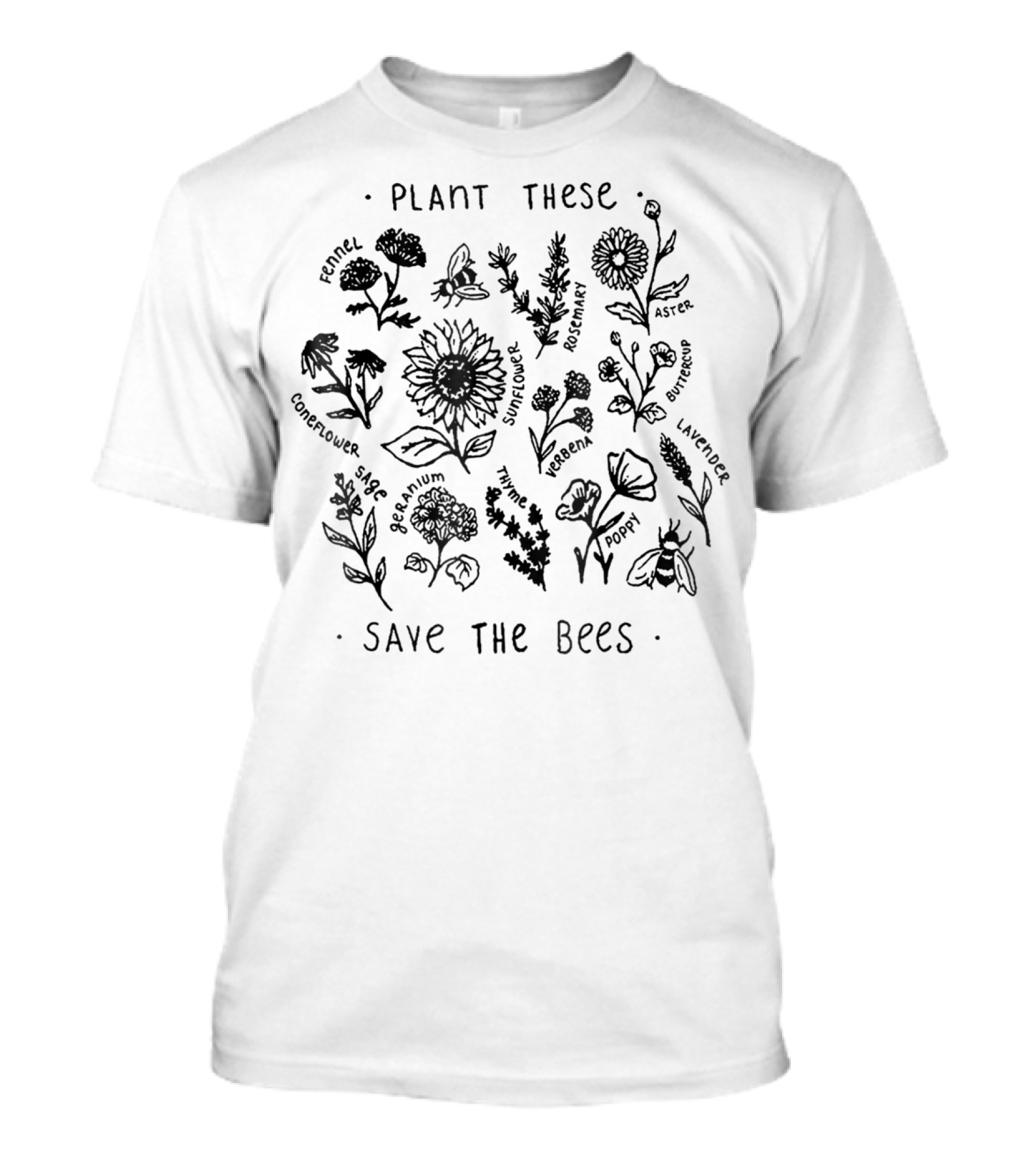 The Plant These Bees Fennel Coneflower Sage Geranium Sunflower Cosmos Goldenrod Yarrow Thyme Poppy Alyssum Lavender T-shirt is designed for everyday wear and a consistent fit. Fabric is pre-shrunk ring-spun cotton with durable stitching. See the size chart below for exact measurements.