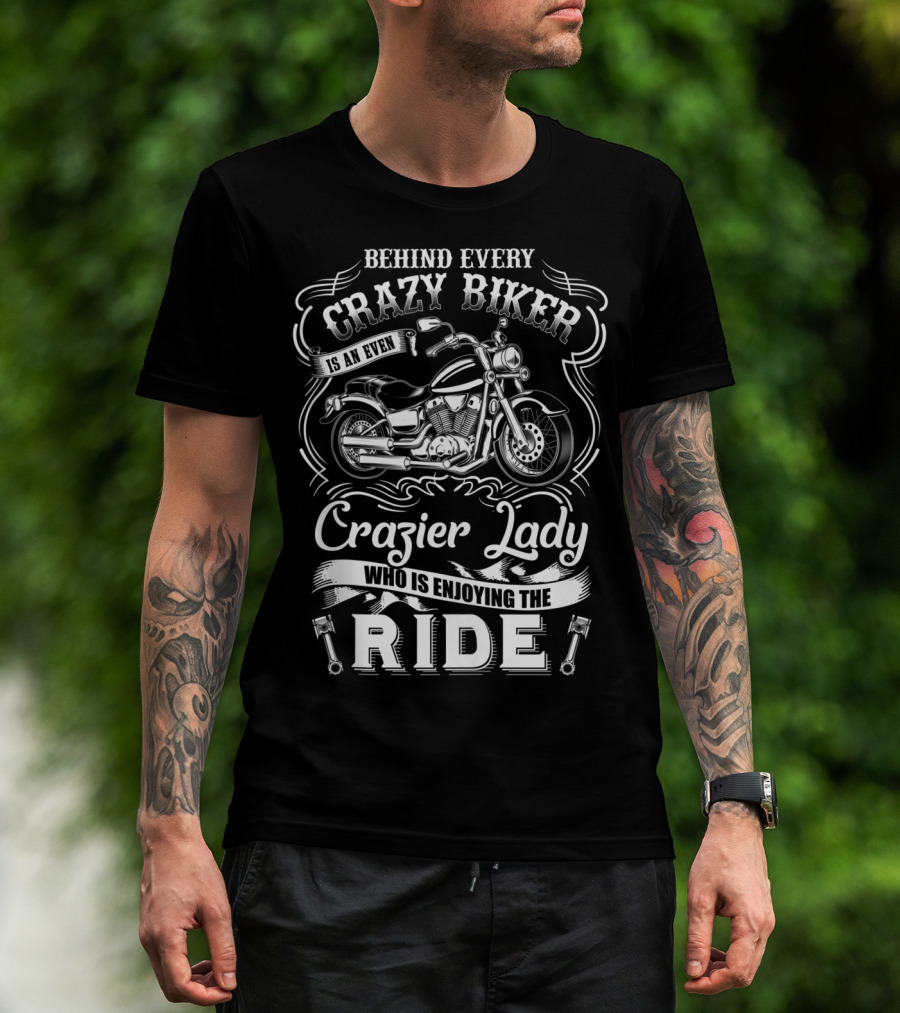 The Behind Every Crazy Biker Is an Even Crazier Lady Who Is Enjoying the Ride T-shirt is designed for everyday wear and a consistent fit. Fabric is pre-shrunk ring-spun cotton with durable stitching. See the size chart below for exact measurements.