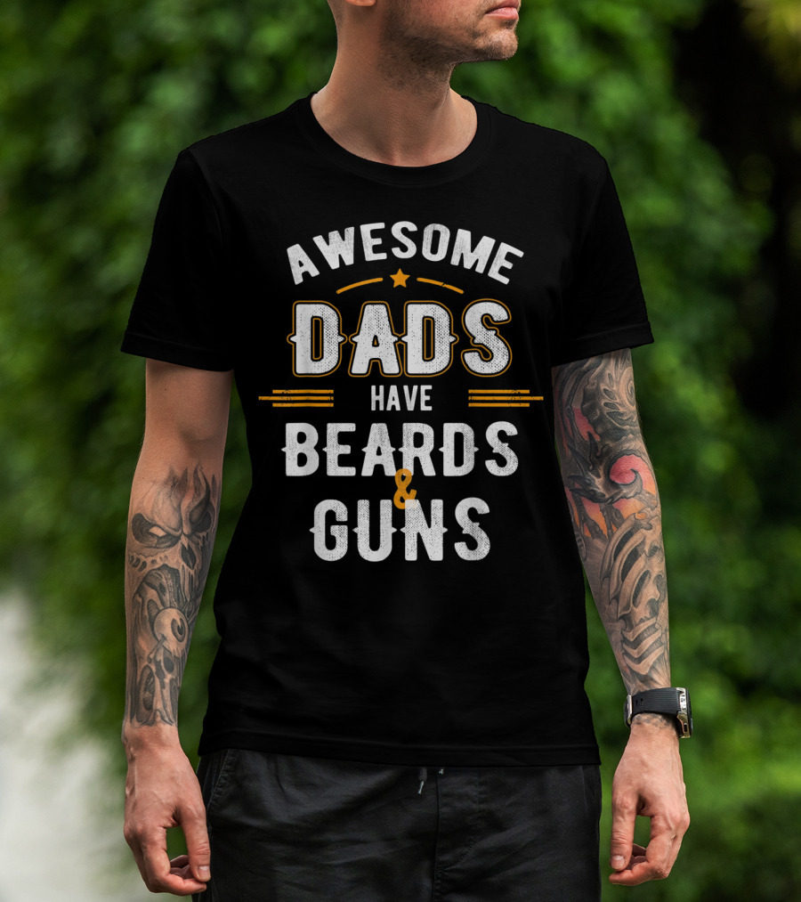 The Awesome Dads Have Beards and Guns T-shirt is designed for everyday wear and a consistent fit. Fabric is pre-shrunk ring-spun cotton with durable stitching. See the size chart below for exact measurements.