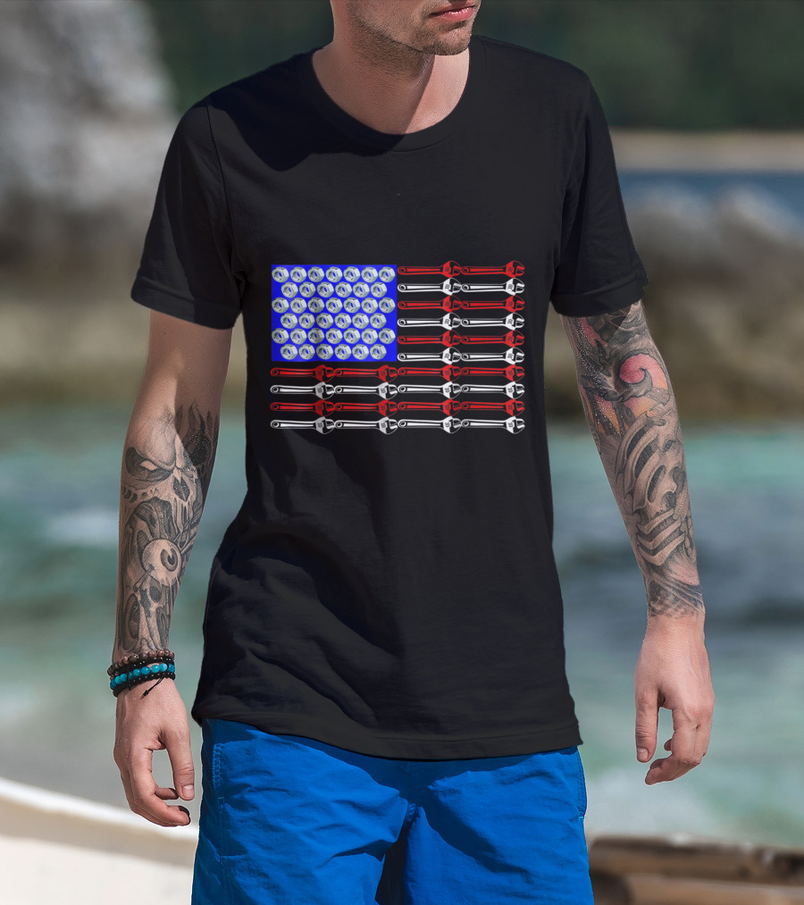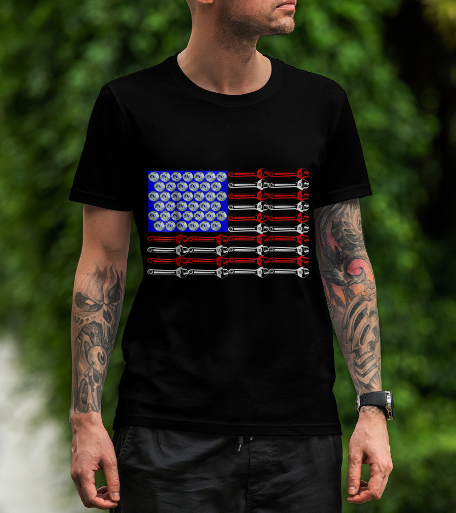 Mechanic Proud American Patriotic USA Flag With Wrenches And Nuts T-Shirt