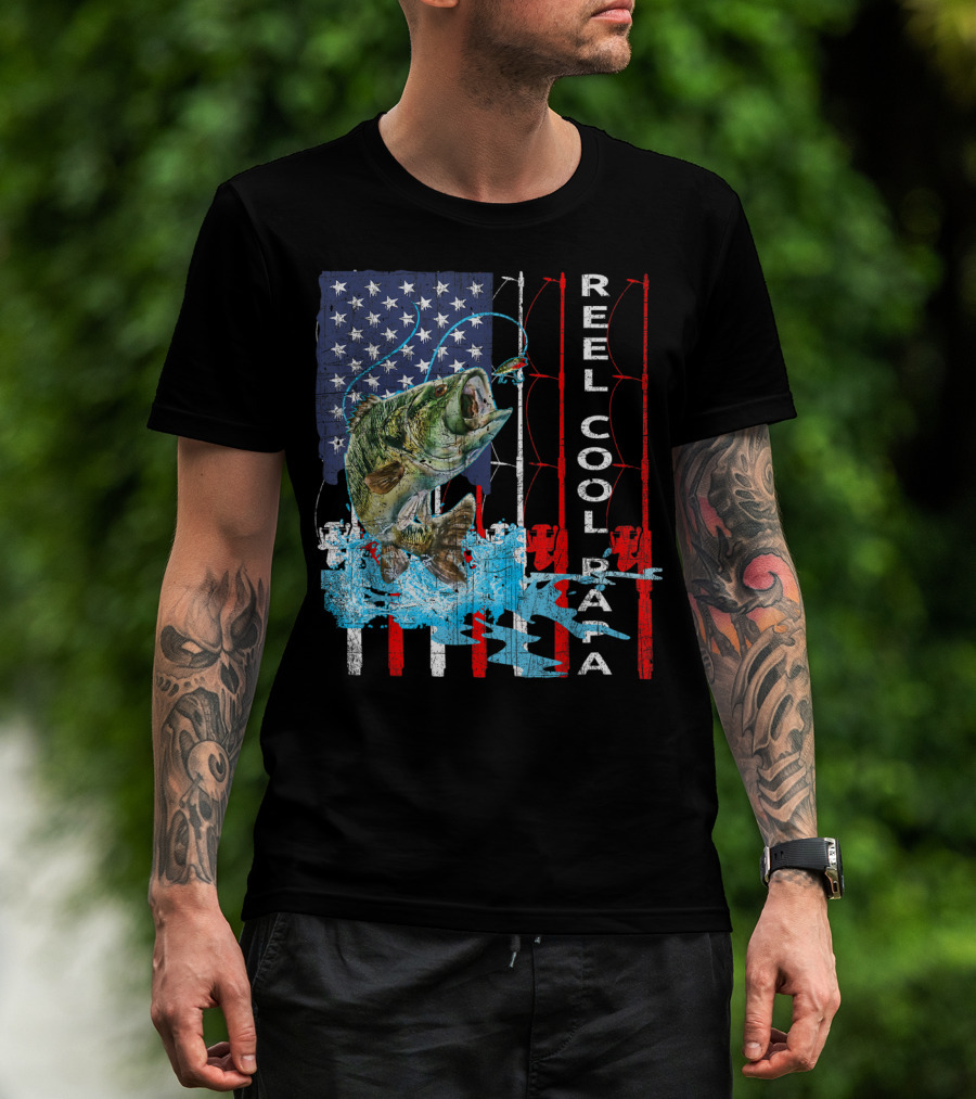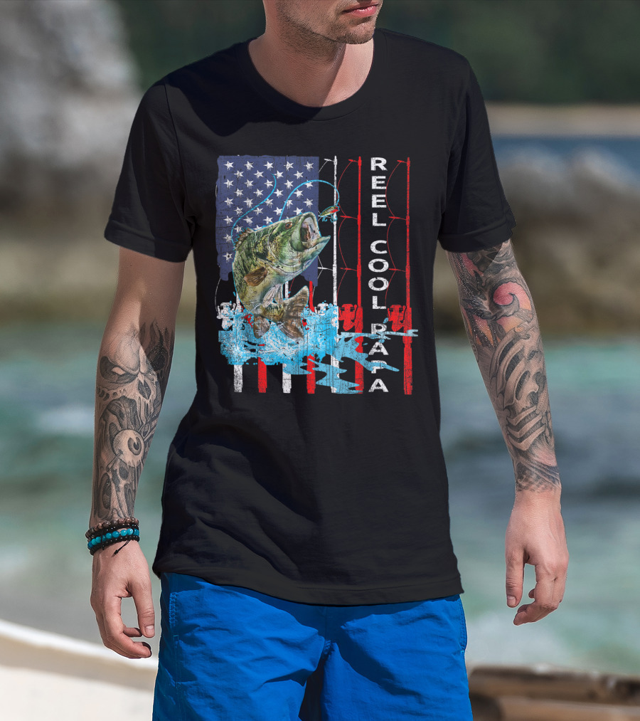 The Reel Cool Papa American Flag Fish T-shirt is designed for everyday wear and a consistent fit. Fabric is pre-shrunk ring-spun cotton with durable stitching. See the size chart below for exact measurements.