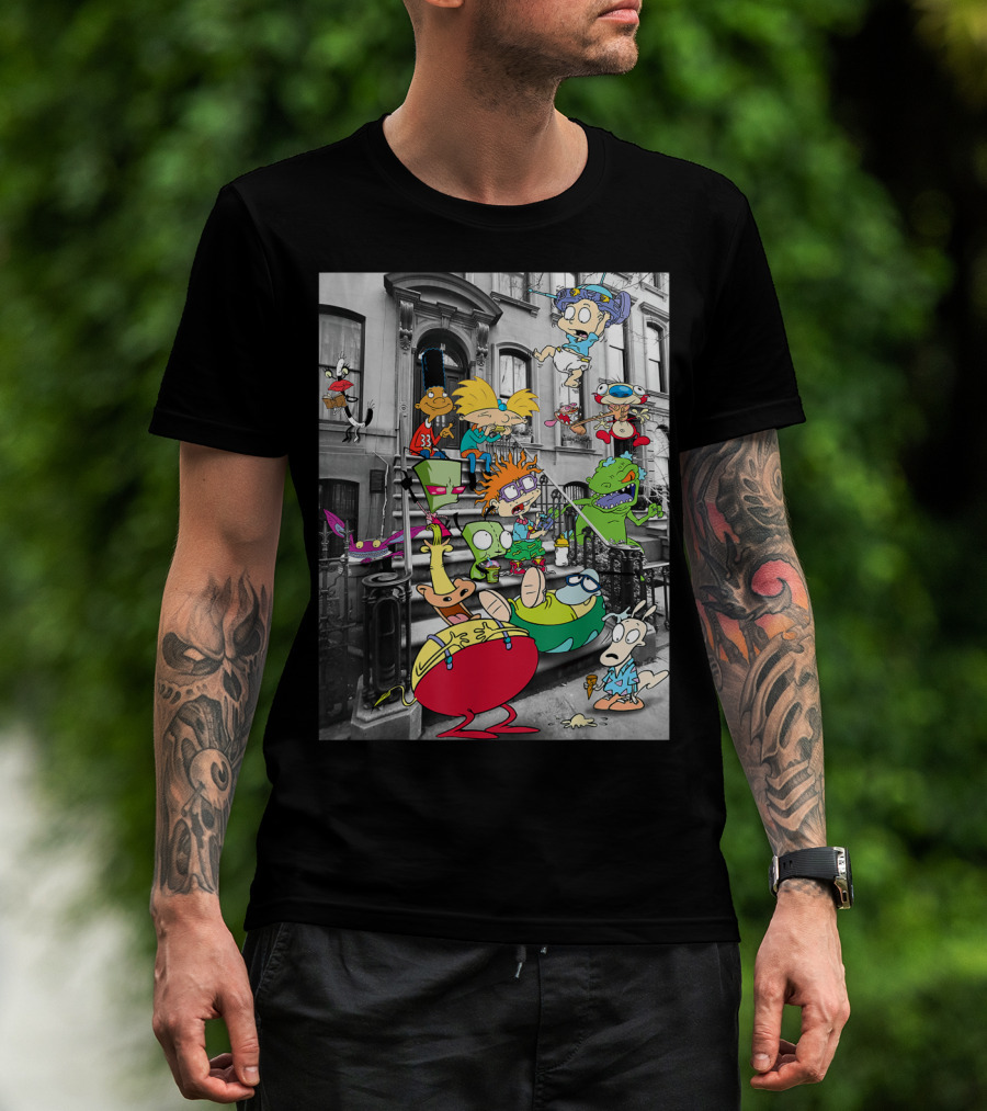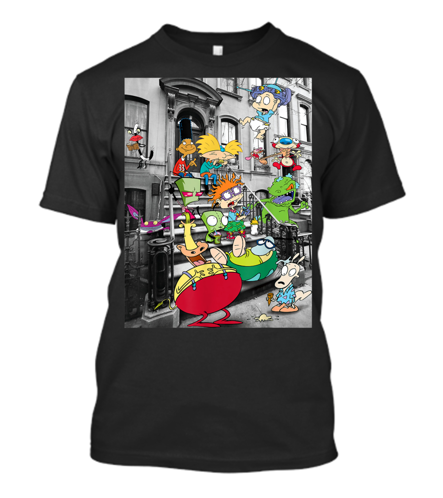 The Nickelodeon Classic Nicktoons Stoop Scene Rugrats Hey Arnold Ren and Stimpy Rocko's Modern Life T-shirt is designed for everyday wear and a consistent fit. Fabric is pre-shrunk ring-spun cotton with durable stitching. See the size chart below for exact measurements.