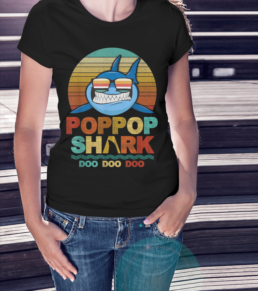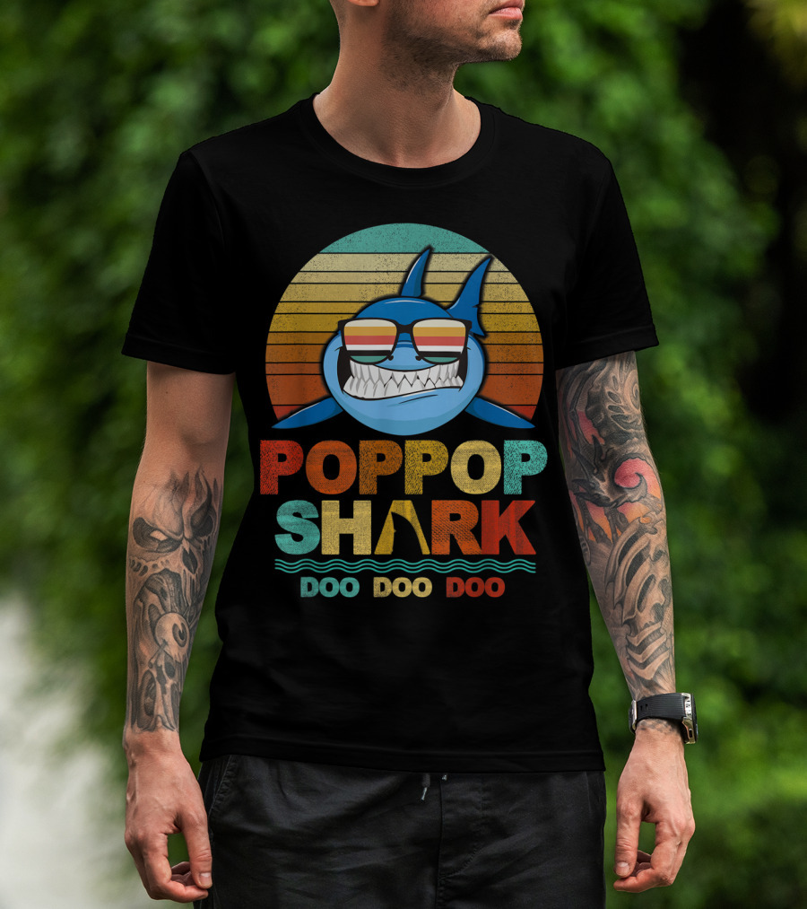The Poppop Shark Doo Doo Doo Retro Sunglasses Vintage Stripes T-shirt is designed for everyday wear and a consistent fit. Fabric is pre-shrunk ring-spun cotton with durable stitching. See the size chart below for exact measurements.