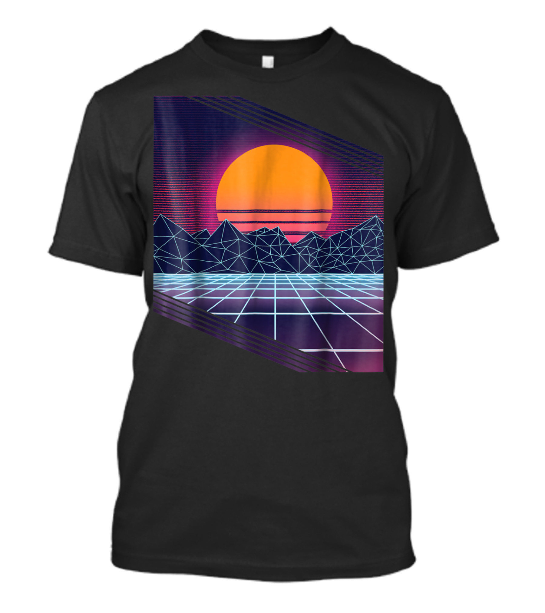 The Vaporwave Synthwave Cyber Sunset with Neon Grid and Mountains T-shirt is designed for everyday wear and a consistent fit. Fabric is pre-shrunk ring-spun cotton with durable stitching. See the size chart below for exact measurements.