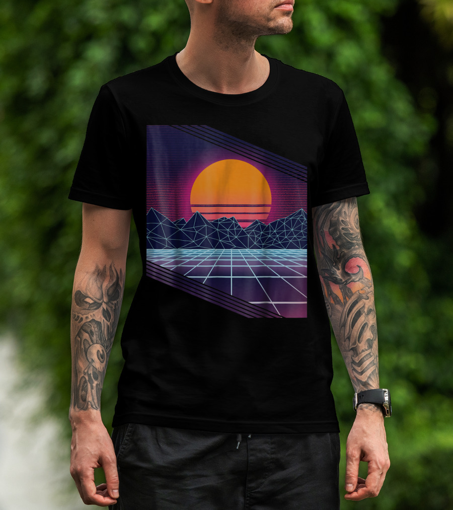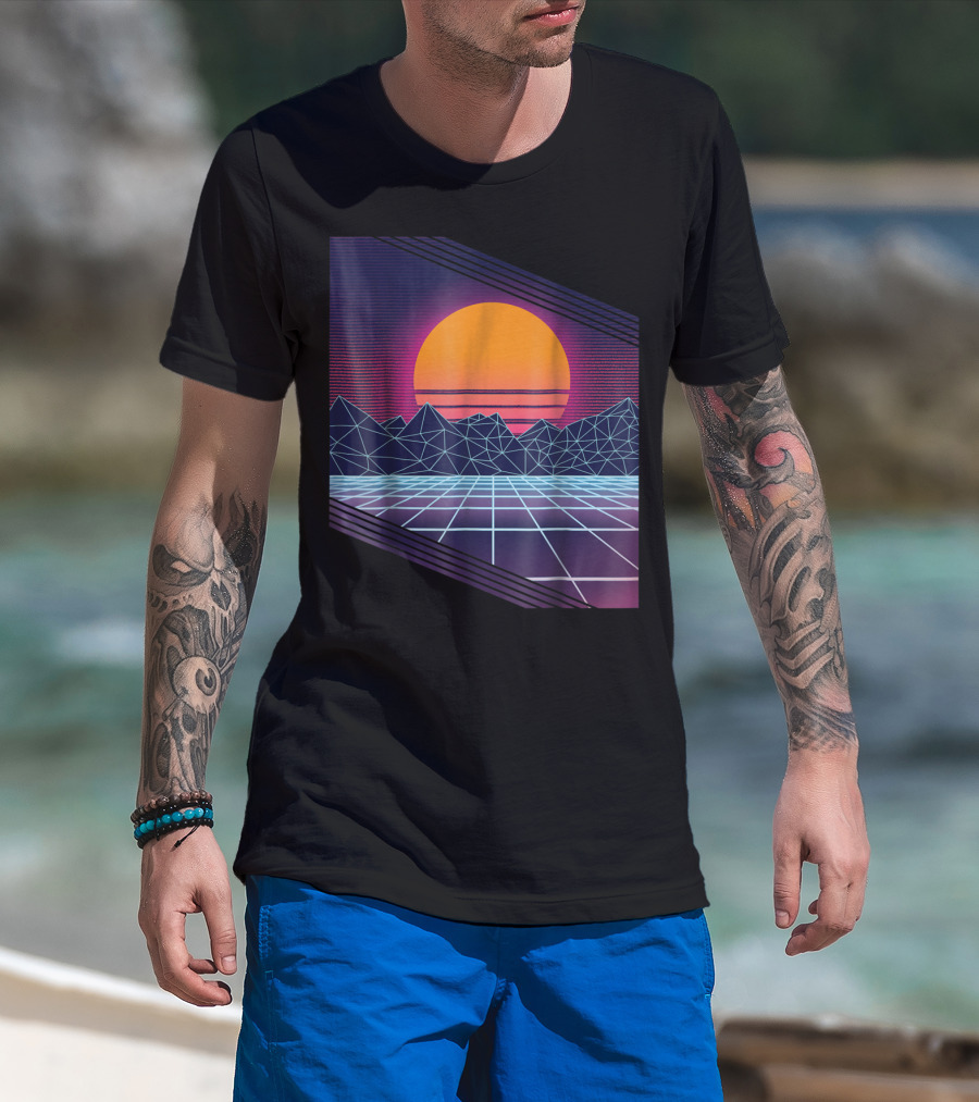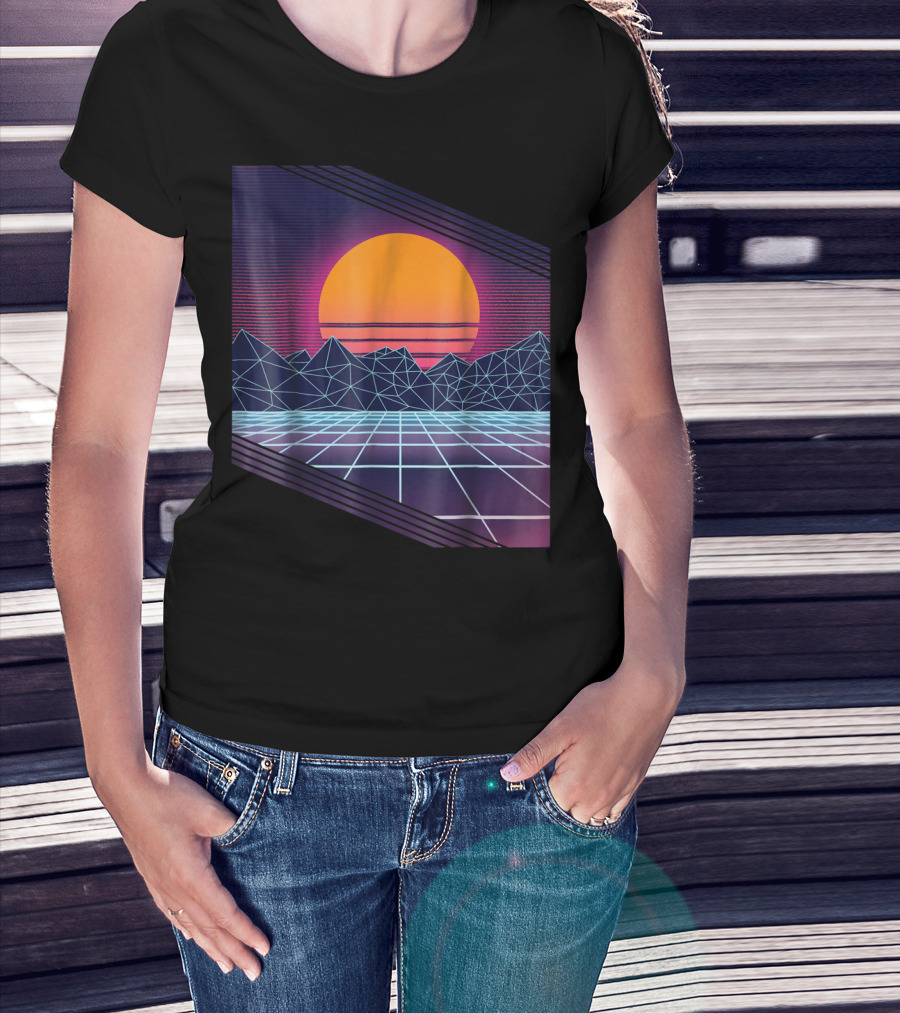 Vaporwave Synthwave Cyber Sunset With Neon Grid And Mountains T-Shirt