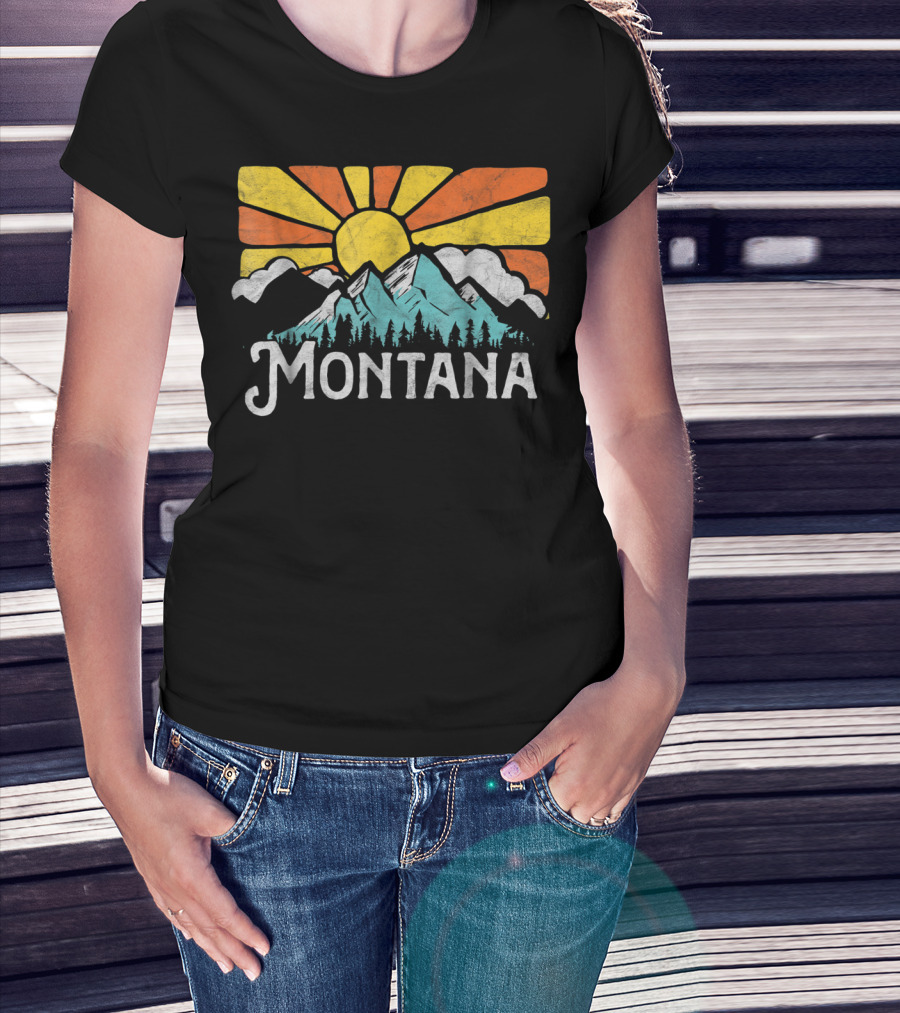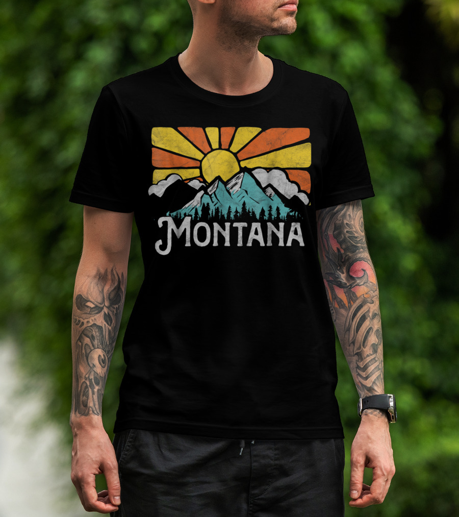 The Montana Eighties Style Mountains Sun Retro T-shirt is designed for everyday wear and a consistent fit. Fabric is pre-shrunk ring-spun cotton with durable stitching. See the size chart below for exact measurements.