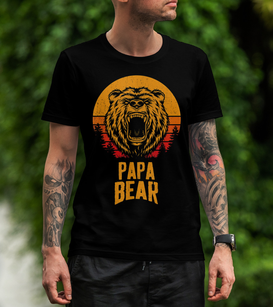 The Papa Bear Father's Day Sunset Roaring Bear Forest Scene T-shirt is designed for everyday wear and a consistent fit. Fabric is pre-shrunk ring-spun cotton with durable stitching. See the size chart below for exact measurements.