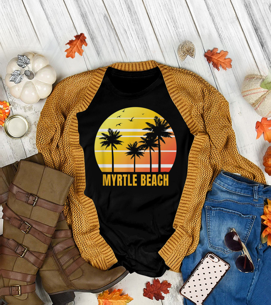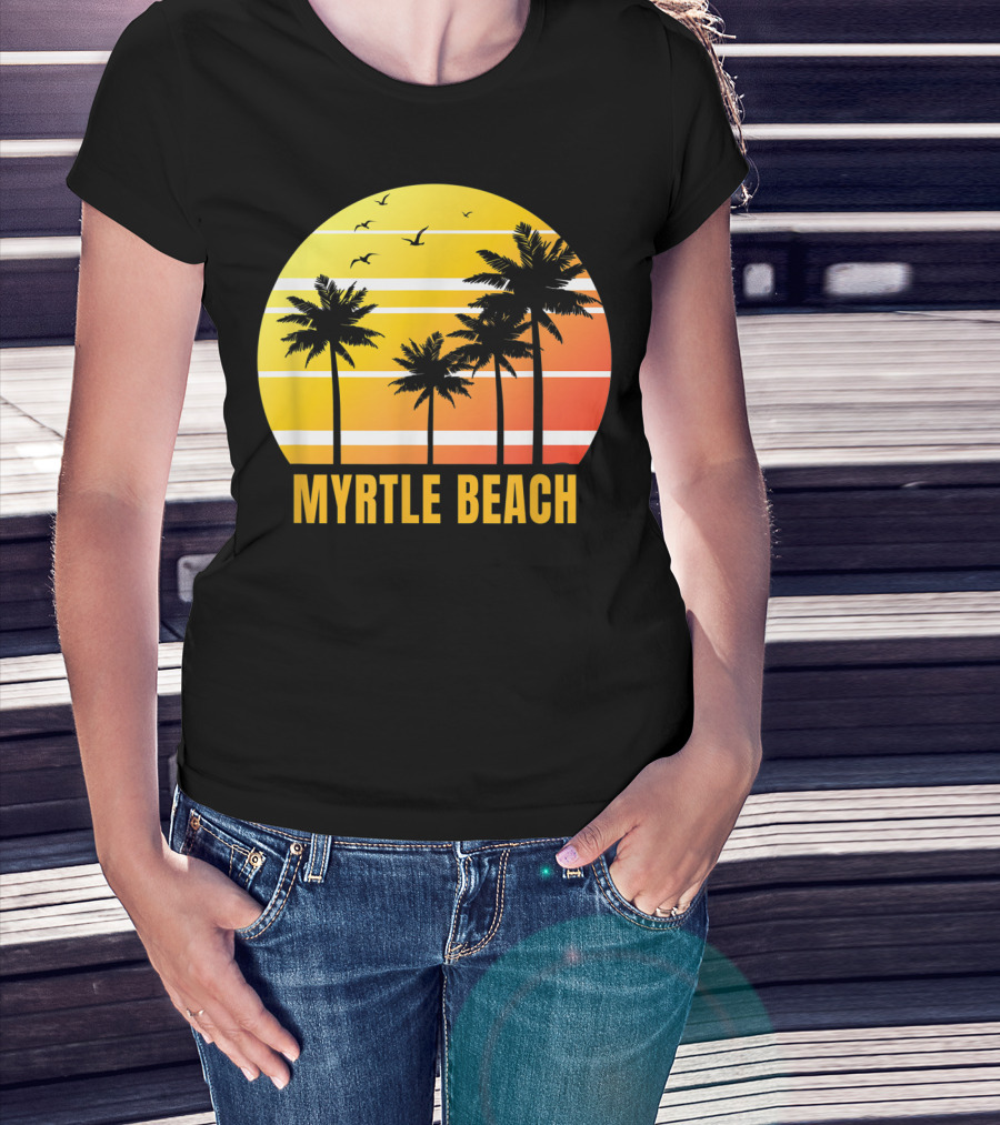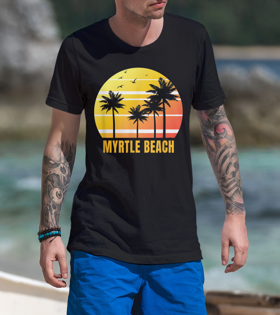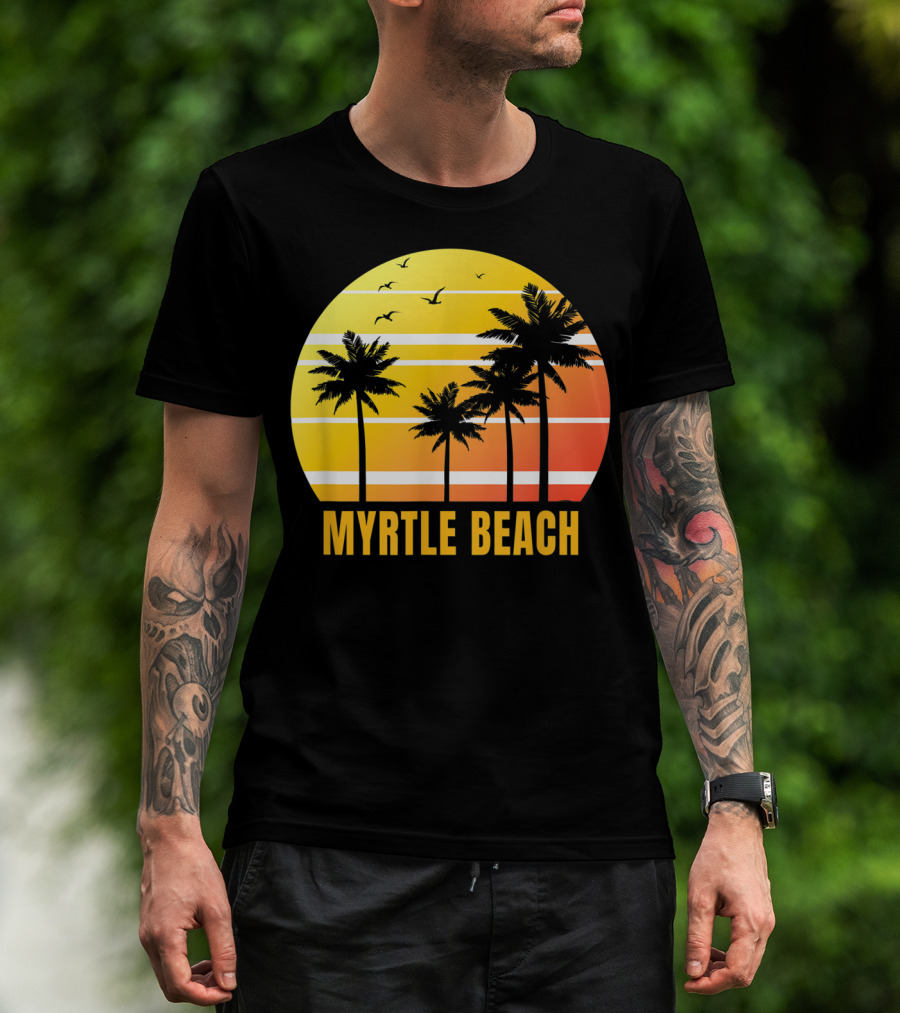 The Myrtle Beach South Carolina Palm Trees Sunset Vacation Souvenir T-shirt is designed for everyday wear and a consistent fit. Fabric is pre-shrunk ring-spun cotton with durable stitching. See the size chart below for exact measurements.