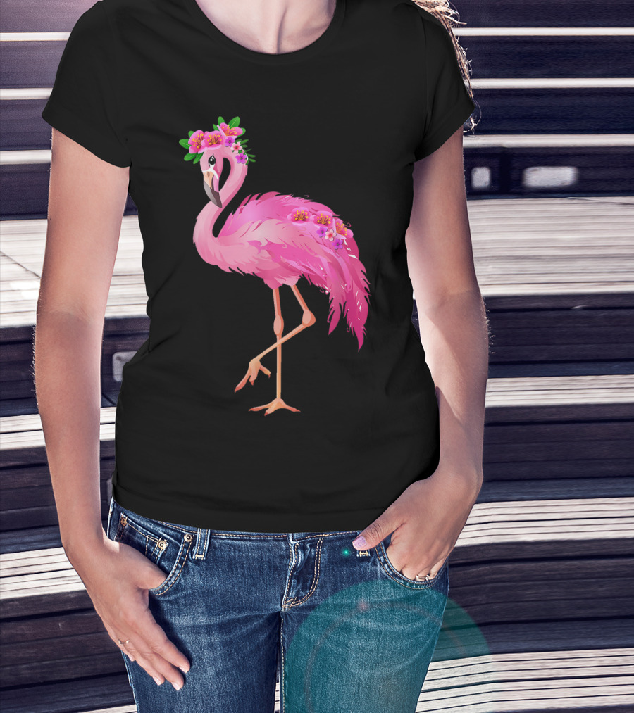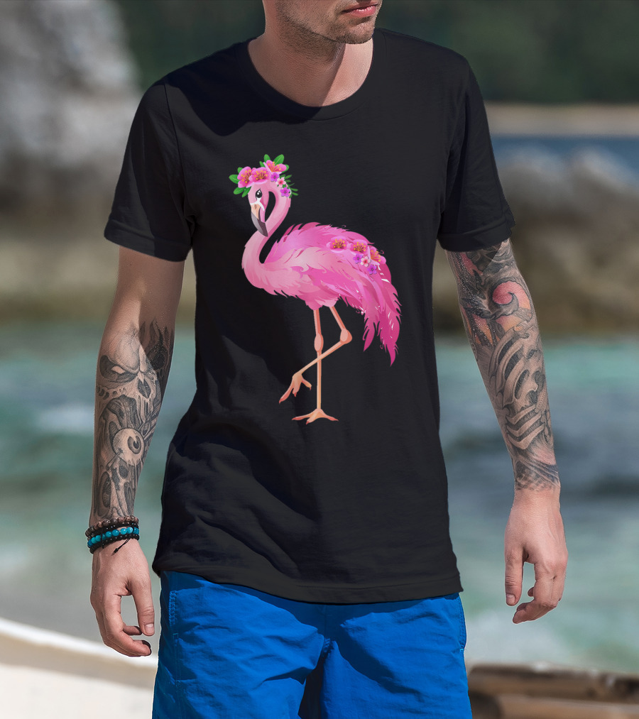 Pink Flamingo With Watercolor Hawaiian Flower Crown And Feathers T-Shirt