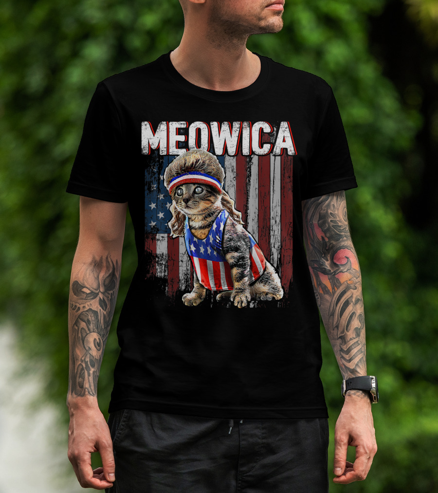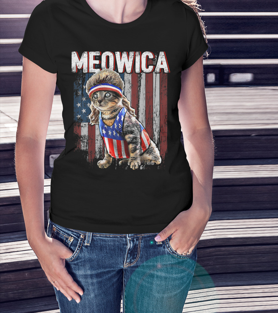 The Meowica Cat Mullet American Flag Patriotic Kitten in Stars and Stripes Vest and Headband in Front of American Flag T-shirt is designed for everyday wear and a consistent fit. Fabric is pre-shrunk ring-spun cotton with durable stitching. See the size chart below for exact measurements.