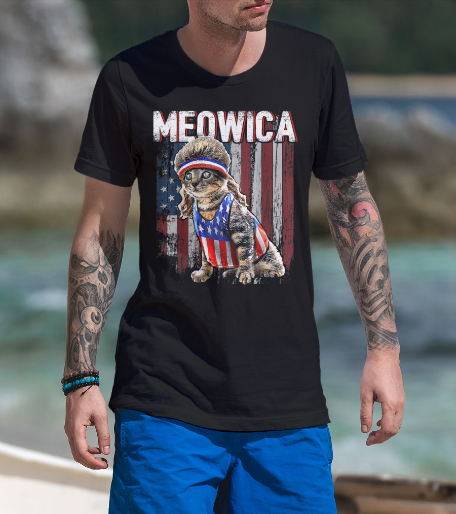 Meowica Cat Mullet American Flag Patriotic Kitten In Stars And Stripes Vest And Headband In Front Of American Flag T-Shirt
