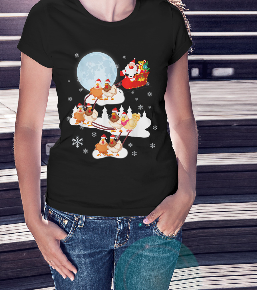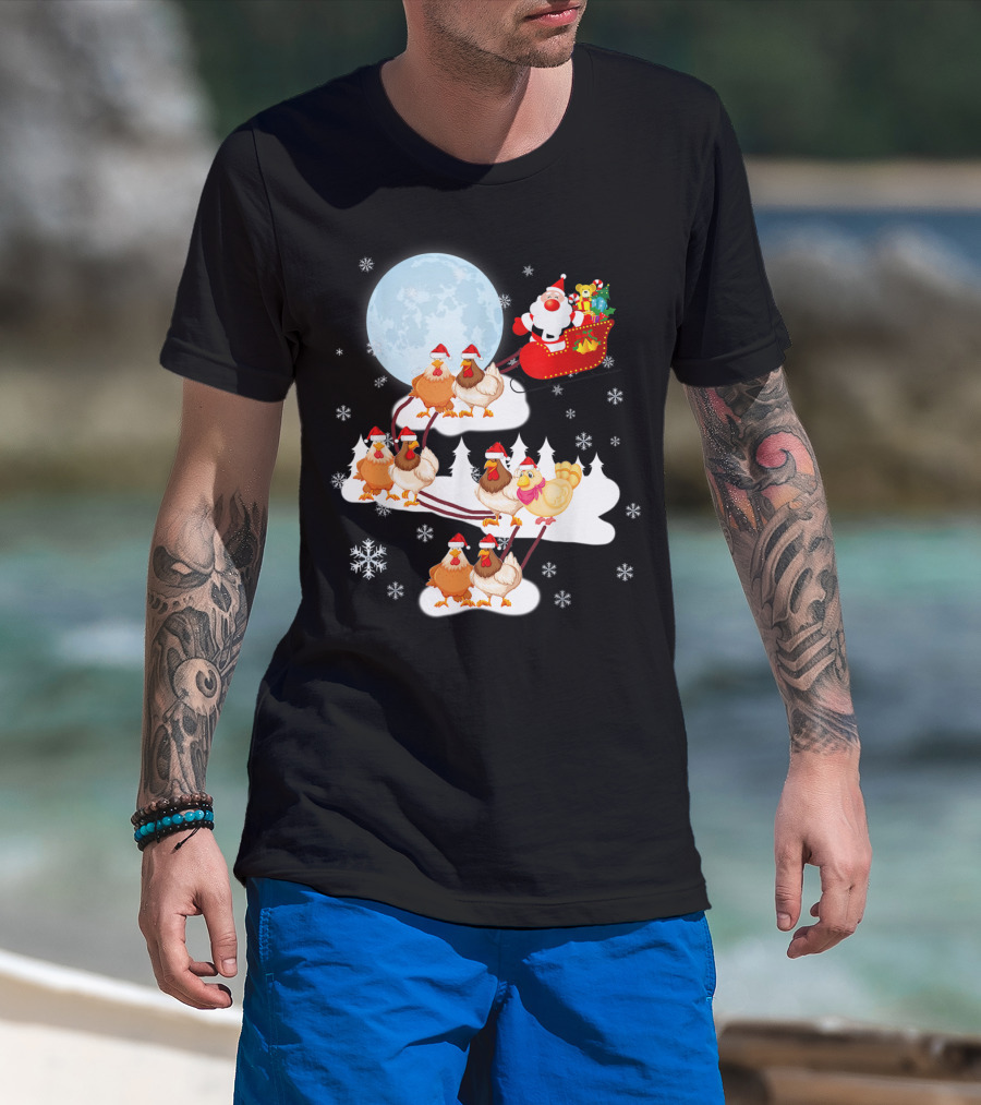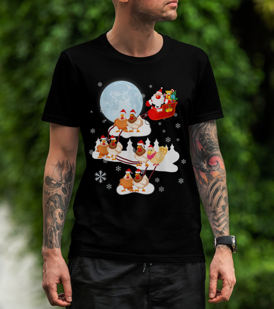 Santa Sleigh Sled Riding Chickens Full Moon Christmas Snowflakes T-Shirt