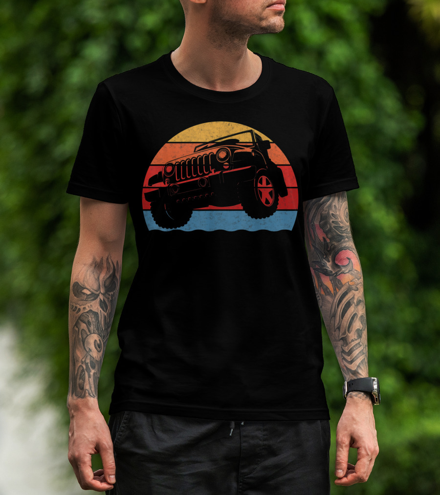 The Retro Vintage Jeeps Great 4x4 70s Sunset Stripes T-shirt is designed for everyday wear and a consistent fit. Fabric is pre-shrunk ring-spun cotton with durable stitching. See the size chart below for exact measurements.