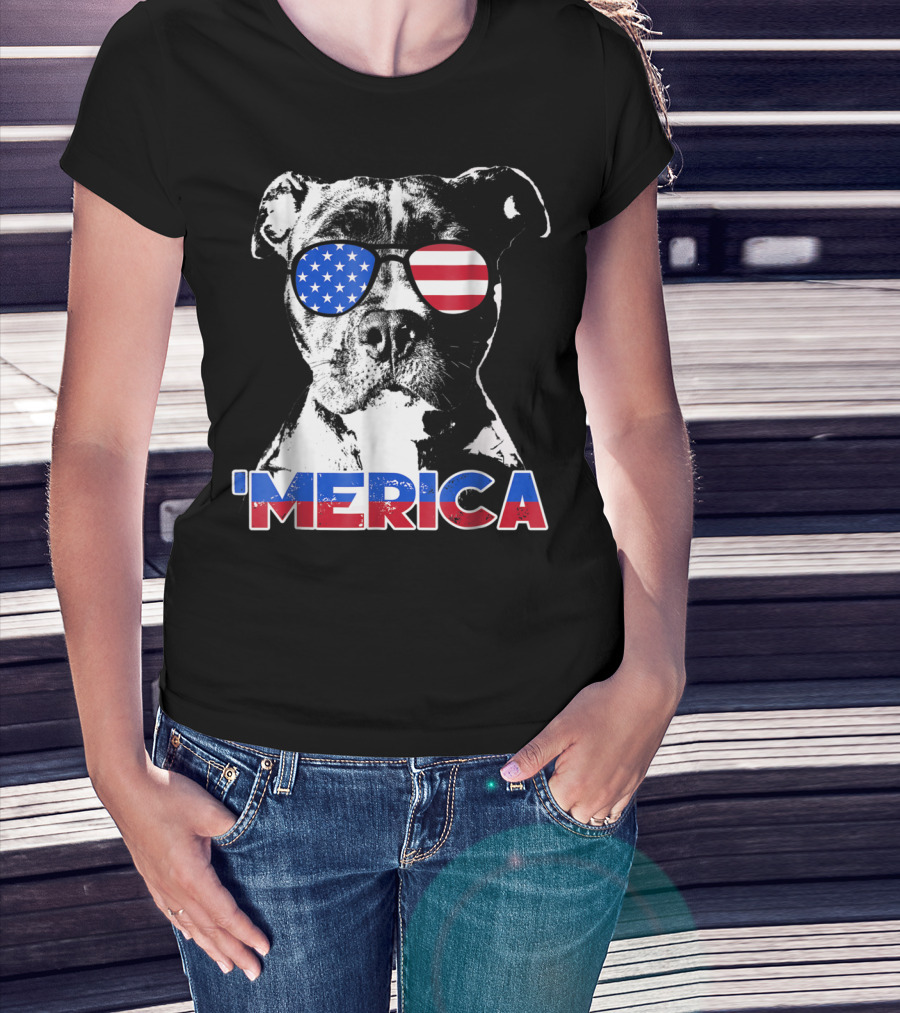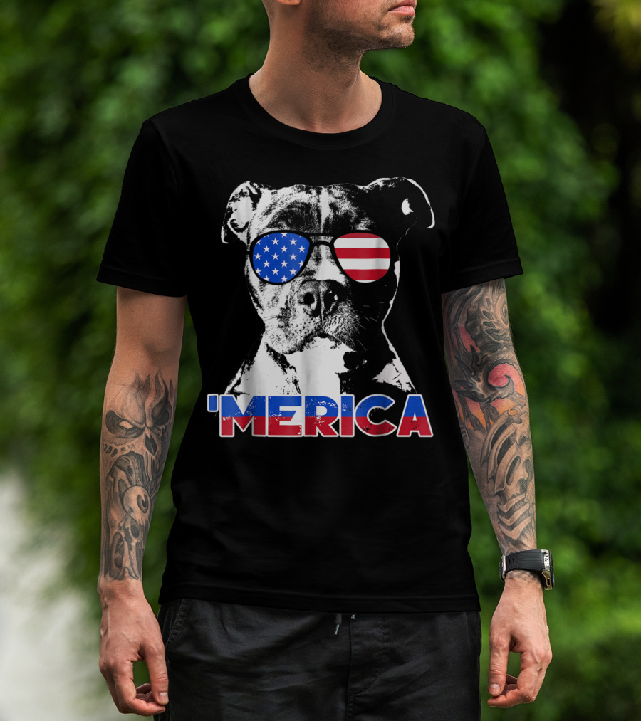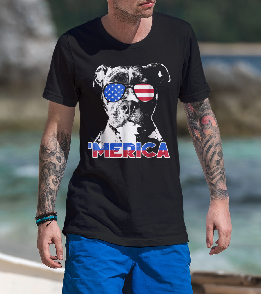 Patriot Pitbull 'Merica With American Flag Sunglasses T-Shirt