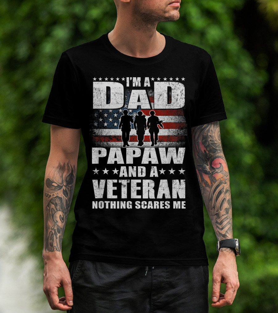 The I'm A Dad Papaw And A Veteran Nothing Scares Me Flag T-shirt is designed for everyday wear and a consistent fit. Fabric is pre-shrunk ring-spun cotton with durable stitching. See the size chart below for exact measurements.