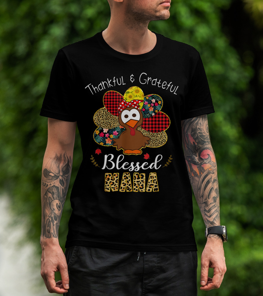 Thankful Grateful Blessed Nana Leopard Plaid Floral Turkey T-Shirt