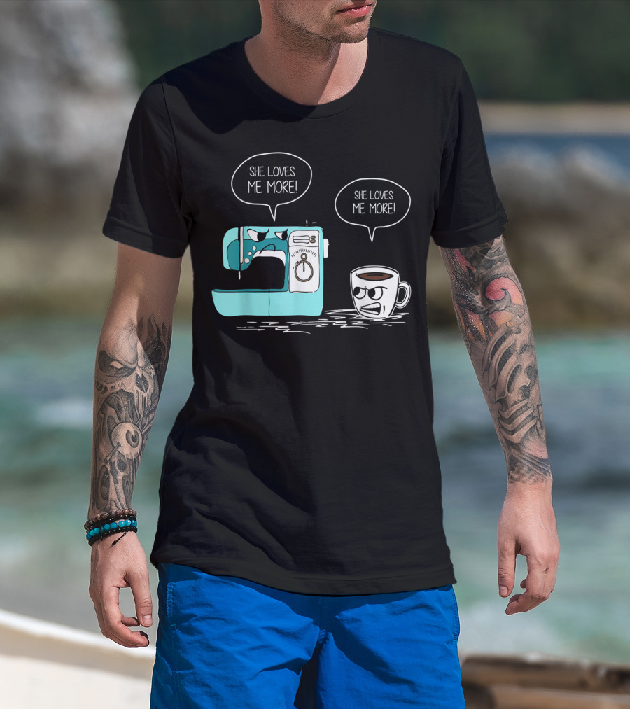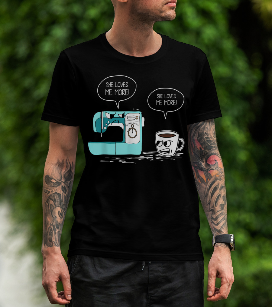 She Loves Me More Sewing Machine Coffee Rivalry T-Shirt