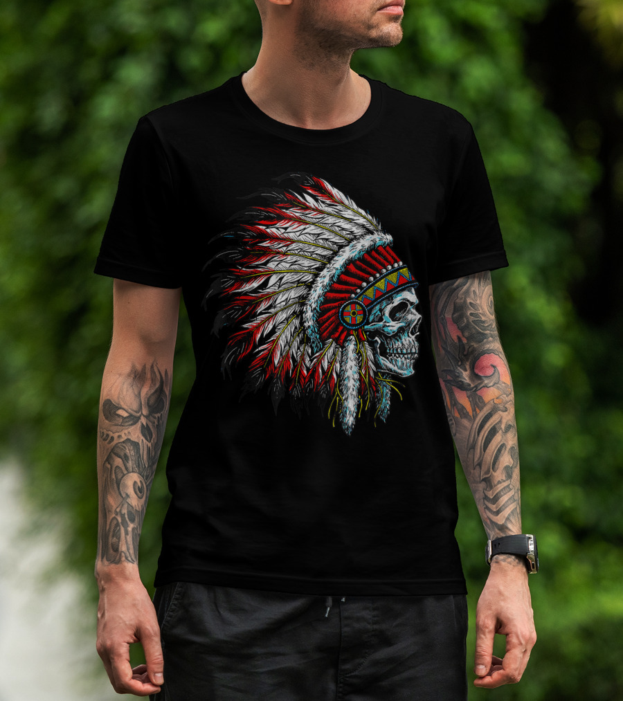 The Skull Native Indian Chief Eagle Feather Headdress Vintage American T-shirt is designed for everyday wear and a consistent fit. Fabric is pre-shrunk ring-spun cotton with durable stitching. See the size chart below for exact measurements.