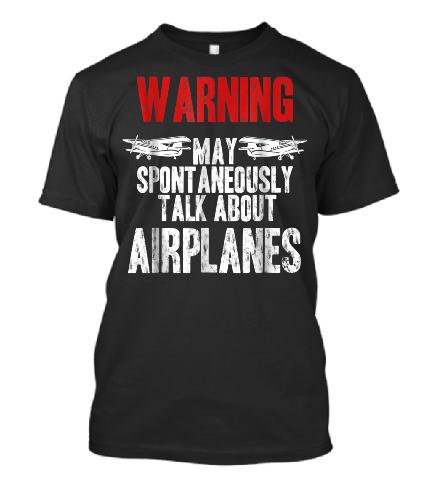 The WARNING May Spontaneously Talk About Airplanes T-shirt is designed for everyday wear and a consistent fit. Fabric is pre-shrunk ring-spun cotton with durable stitching. See the size chart below for exact measurements.