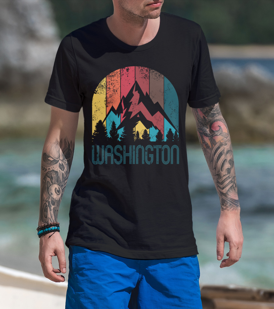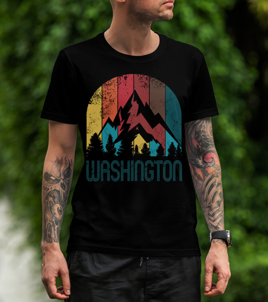 The Washington Retro Mountain Landscape Forest Silhouette Vintage Multicolor Stripes T-shirt is designed for everyday wear and a consistent fit. Fabric is pre-shrunk ring-spun cotton with durable stitching. See the size chart below for exact measurements.