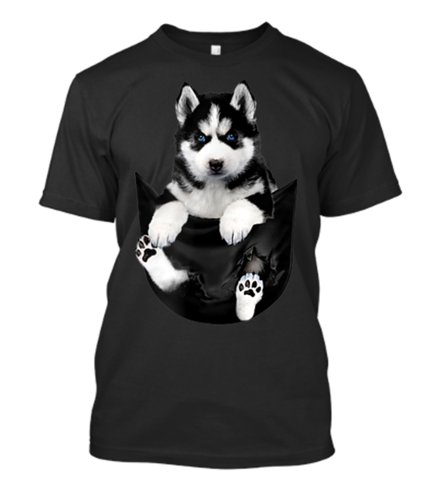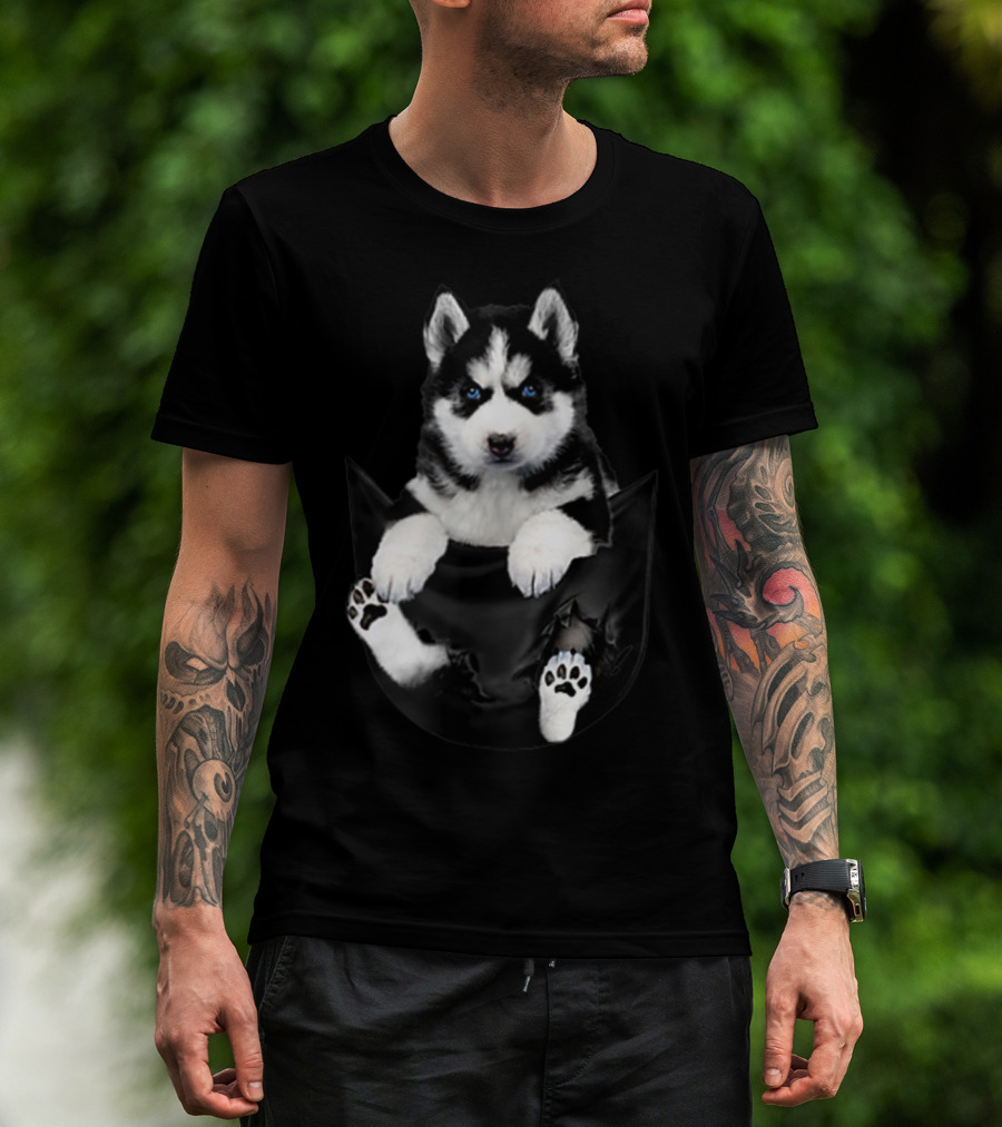 Siberian Husky Puppy Peeking Out Of Pocket T-Shirt