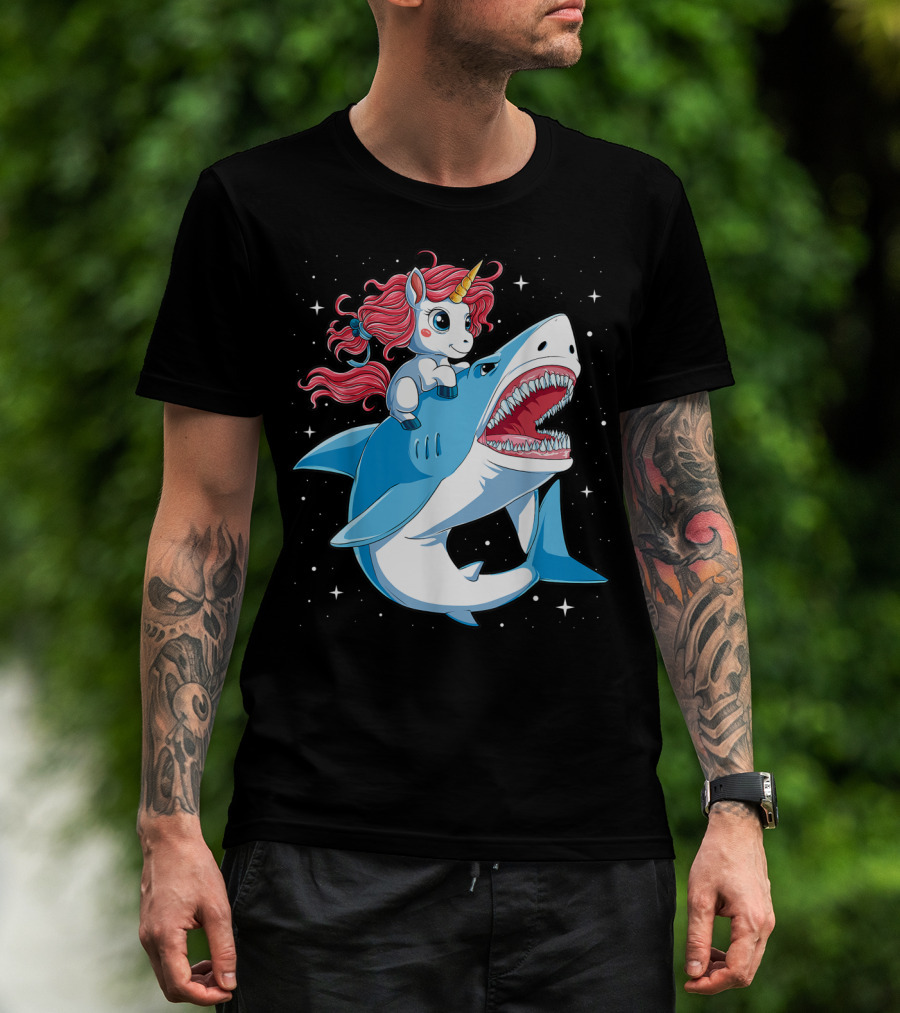 Unicorn Riding Shark In Space Galaxy Adventure T-Shirt